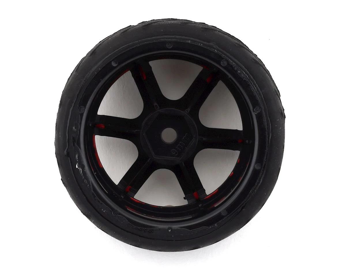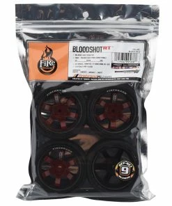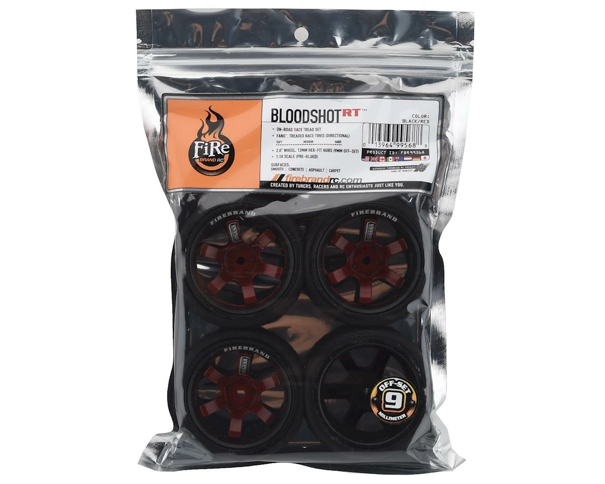 Firebrand Bloodshot RT9 Pre-Mounted On-Road Tires feature the BloodShot-RT9 on-road race wheel, mounted to Fang treaded racing tires. Both are made from the highest quality ABS plastic and rubber materials available. The Fangs tire is a low-profile and directional, medium-compound, treaded race tire. These race wheels and tires fit most 1:10 scale, on-road, radio-controlled cars. 2.0″ x 1.0″ BloodShot 9mm, “deep-dish” race wheels are available in Rocket Red w/Black accents and, if desired, can be painted with poly carbonate paint.