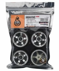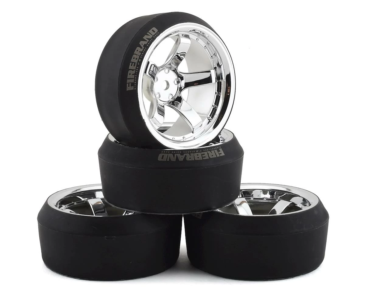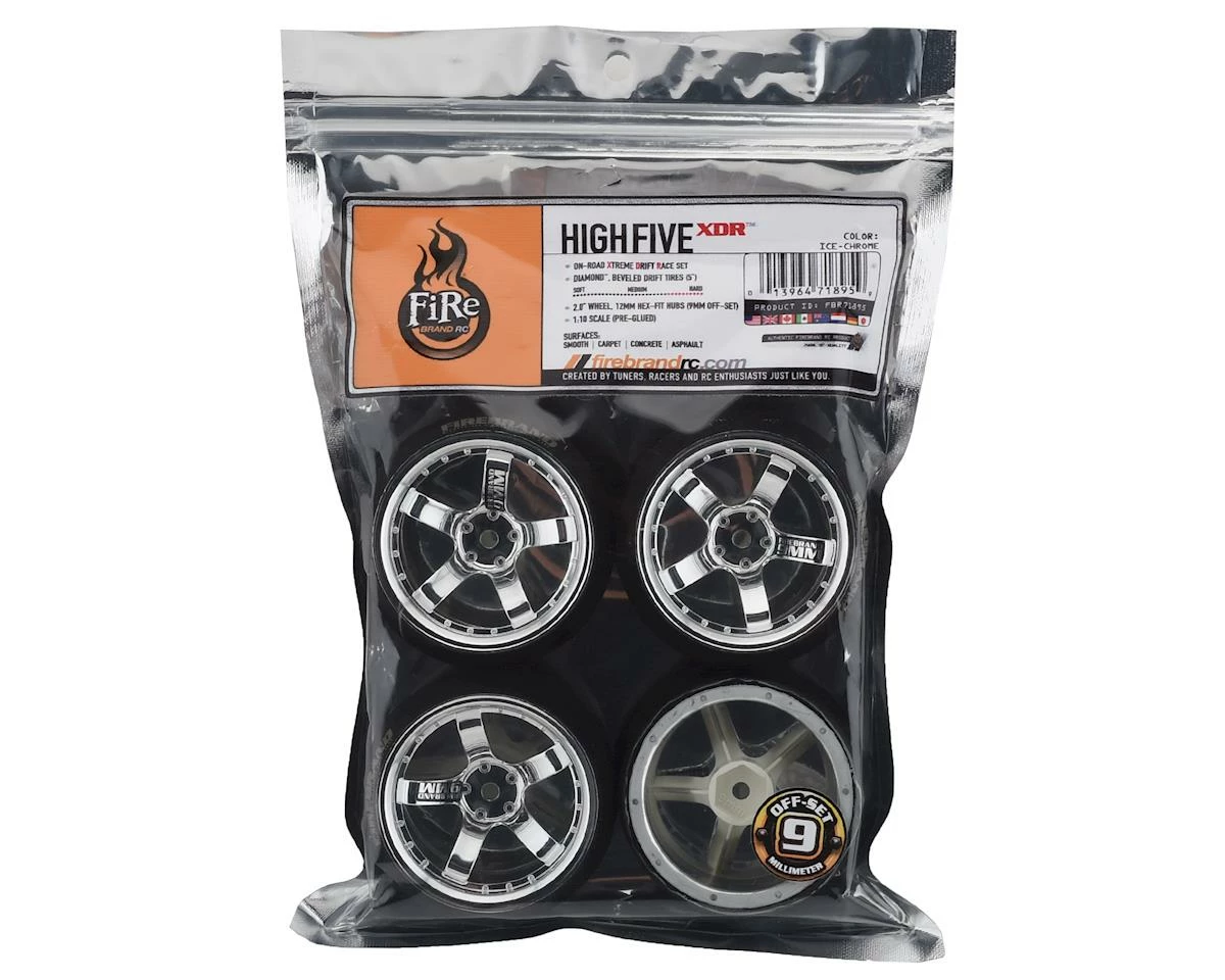 Firebrand Highfive XDR9 5° Pre-Mounted Slick Drift Tires feature HighFive-XDR(9) on-road drift wheels mounted to Diamond double-beveled drift tires. Both are made from the highest quality ABS plastic and rubber materials available. The Diamond tires are a super low-profile, low-traction, 45°/5° double-beveled drift tire option. These drift wheels and tires fit most 1:10 scale, on-road, radio-controlled cars. HighFive drift wheels are available in Ice-Chrome™ and, if desired, can be painted with poly carbonate paint. 12mm, hex-fit hubs w/9mm. off-set.