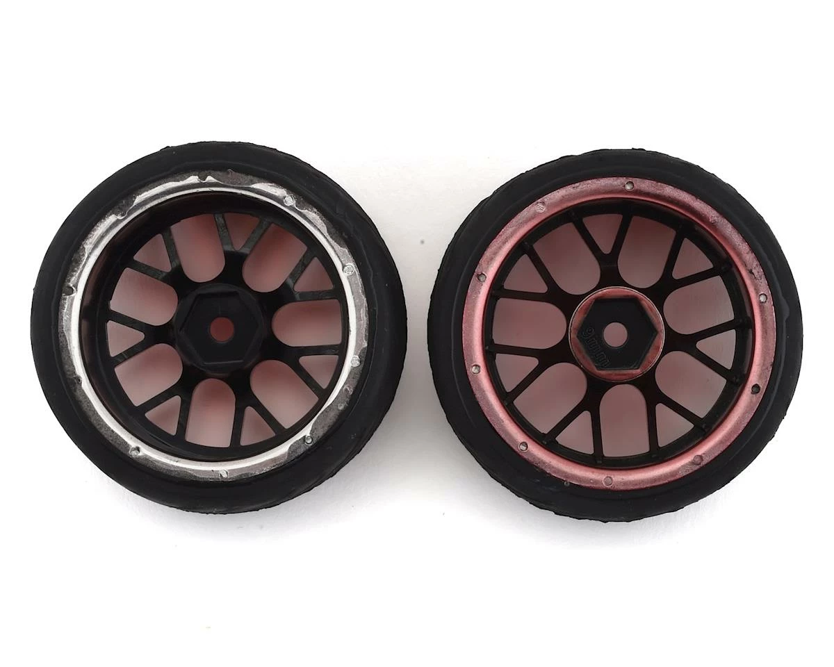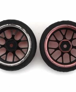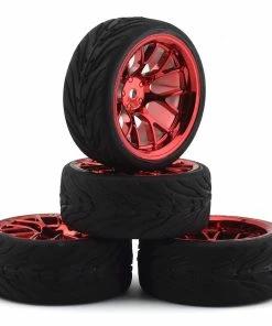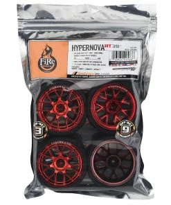 Firebrand Hypernova RT39 Pre-Mounted On-Road Tires feature HyperNova-RT(3/9) on-road race wheels mounted to Fang treaded rubber racing tires. Both are made from the highest quality ABS plastic and rubber materials available. This combo set features two wheels with 3mm hub off-sets and two wheels with 9mm off-sets. The Fangs tires are a low-profile and directional, medium-compound, treaded race tire. These race wheels and tires fit most 1:10 scale, on-road, radio-controlled cars. 2.0″ x 1.0″ HyperNova 3mm and 9mm, race wheels are available in Red Chrome and, if desired, can be painted with poly carbonate paint.