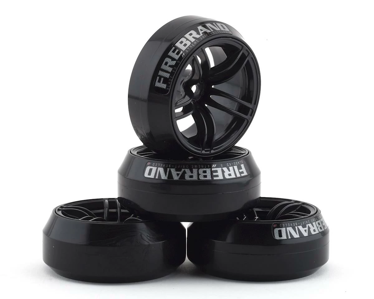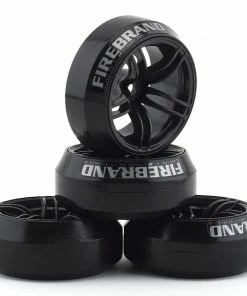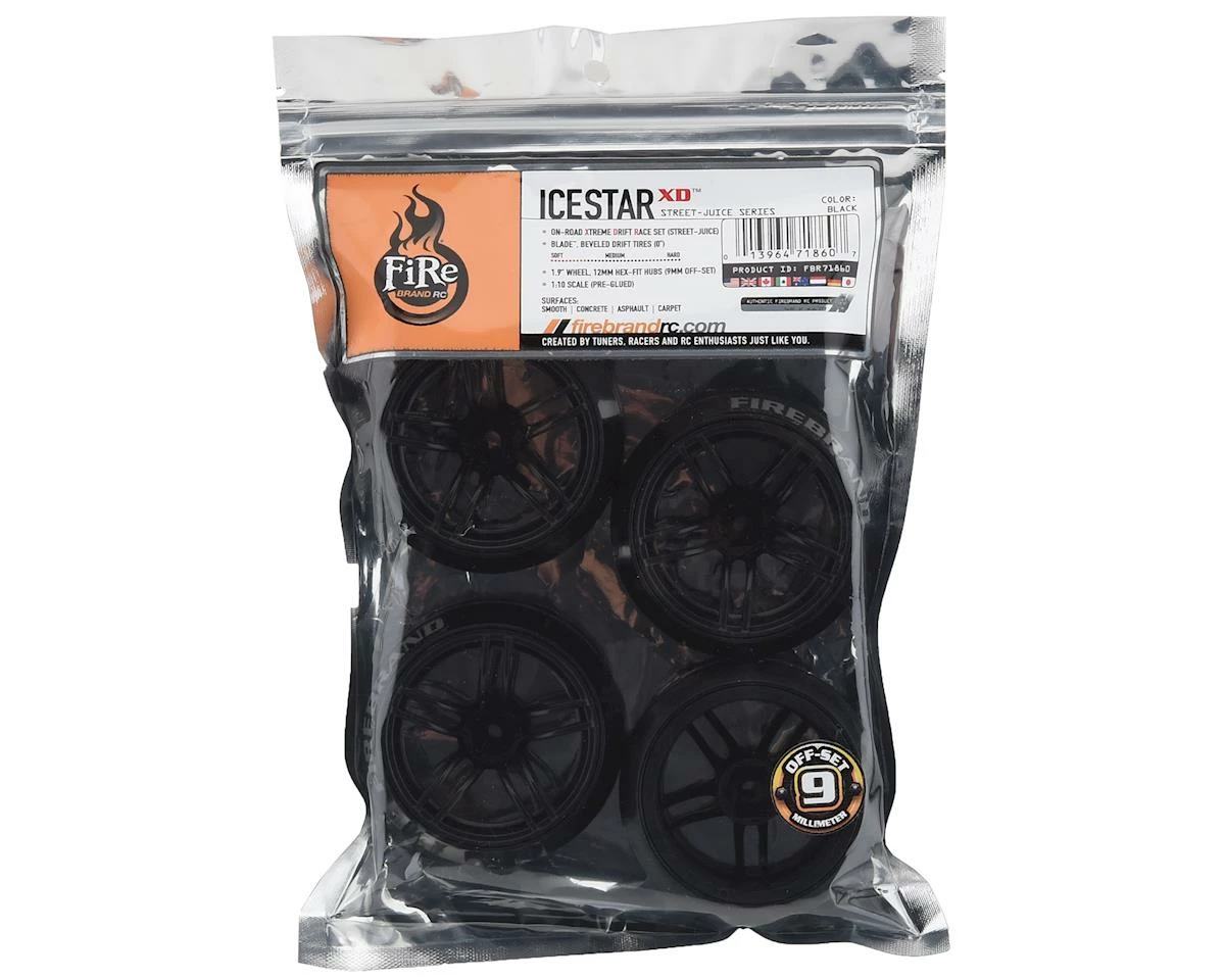Firebrand Icestar XD9 0° Pre-Mounted Slick Drift Tires feature IceStar-XD on-road drift wheels mounted to Blade beveled drift tires. Both are made from the highest quality ABS plastic and rubber materials available. The wheels arrive at your door fitted with Blades a super low-profile, low-traction, 45º/0º beveled drift tires. These drift wheels and tires fit most 1:10 scale, on-road, radio-controlled cars. 2.0″ x 1.0″ ICESTAR drift wheels are available in BLACK and, if desired, can be painted with poly carbonate paint. 12mm hex-fit hubs w/9mm off-set.