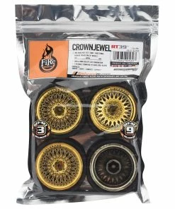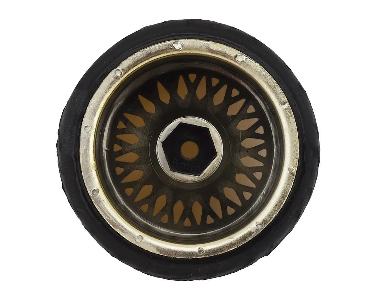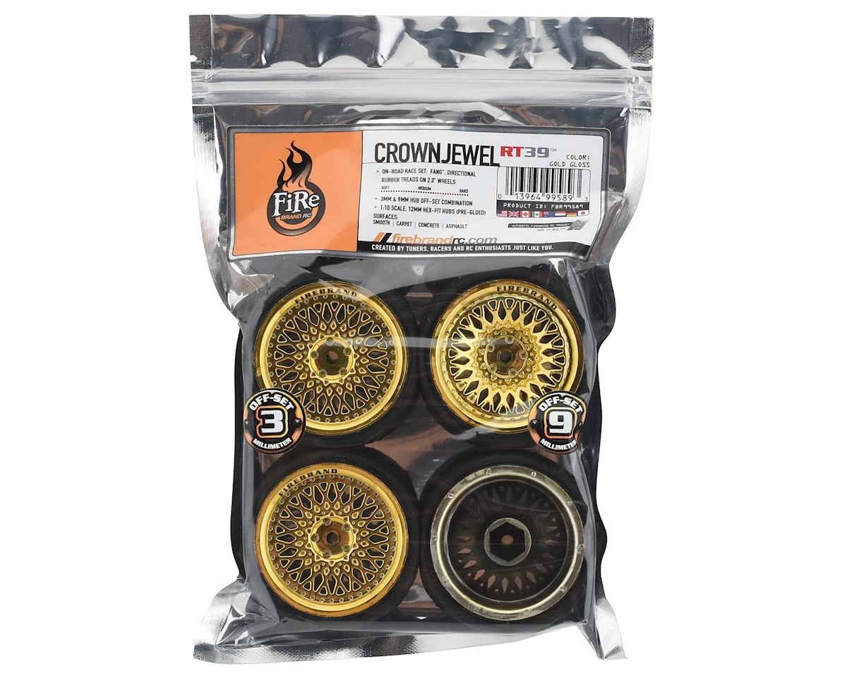 Firebrand Crownjewel RT39 Pre-Mounted On-Road Tires feature the CrownJewel-RT(3/9) on-road race wheel mounted to Fang treaded rubber racing tires. Both are made from the highest quality ABS plastic and rubber materials available. This combo set features two wheels with 3mm hub off-sets and two wheels with 9mm off-sets. The Fang tire is a low-profile and directional, medium-compound, treaded race tire. These race wheels and tires fit most 1:10 scale, on-road, radio-controlled cars. 2.0″ x 1.0″ CrownJewel 3mm and 9mm, race wheels are available in Gold Gloss and, if desired, can be painted with poly carbonate paint.