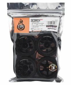 Firebrand Scorch RT3 Pre-Mounted On-Road Tires feature a classic six spoke design that will look great on your ride. The wheels are mounted to the FireFangs tire – a low-profile, medium-compound, treaded race tire. Both are made from the highest quality ABS plastic and rubber materials available. These wheels and tires fit most 1:10 scale, on-road, radio-controlled cars. 2.0″ x 1.0″ SCORCH race wheels are available in BLACK and, if desired, can be painted with poly carbonate paint. Package includes four pre-mounted tires.