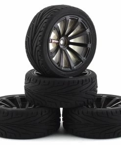 Firebrand Switchblade RT6 Pre-Mounted On-Road Tires are a deep-dish on-road wheel, premounted with Daggers tires – a low-profile, medium-compound, treaded street tire. Both are made from the highest quality ABS plastic and rubber materials available. These fit most 1:10 scale, on-road, radio-controlled cars. 1.9″ x 1.0″ SwitchBlade drift wheels are available in Smoke Chrome and, if desired, can be painted with poly carbonate paint. 12mm hex-fit hubs w/6mm off-set.