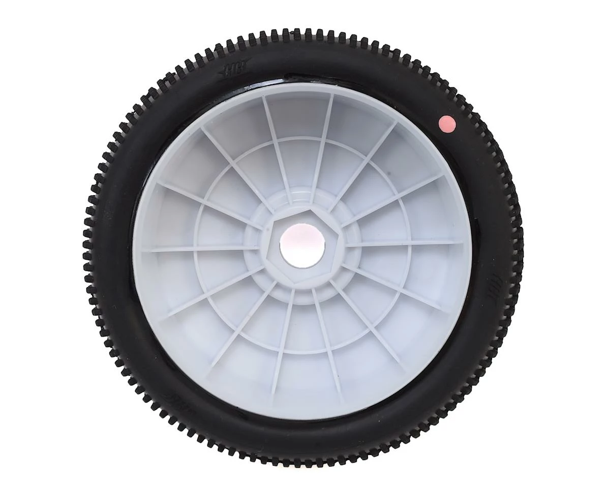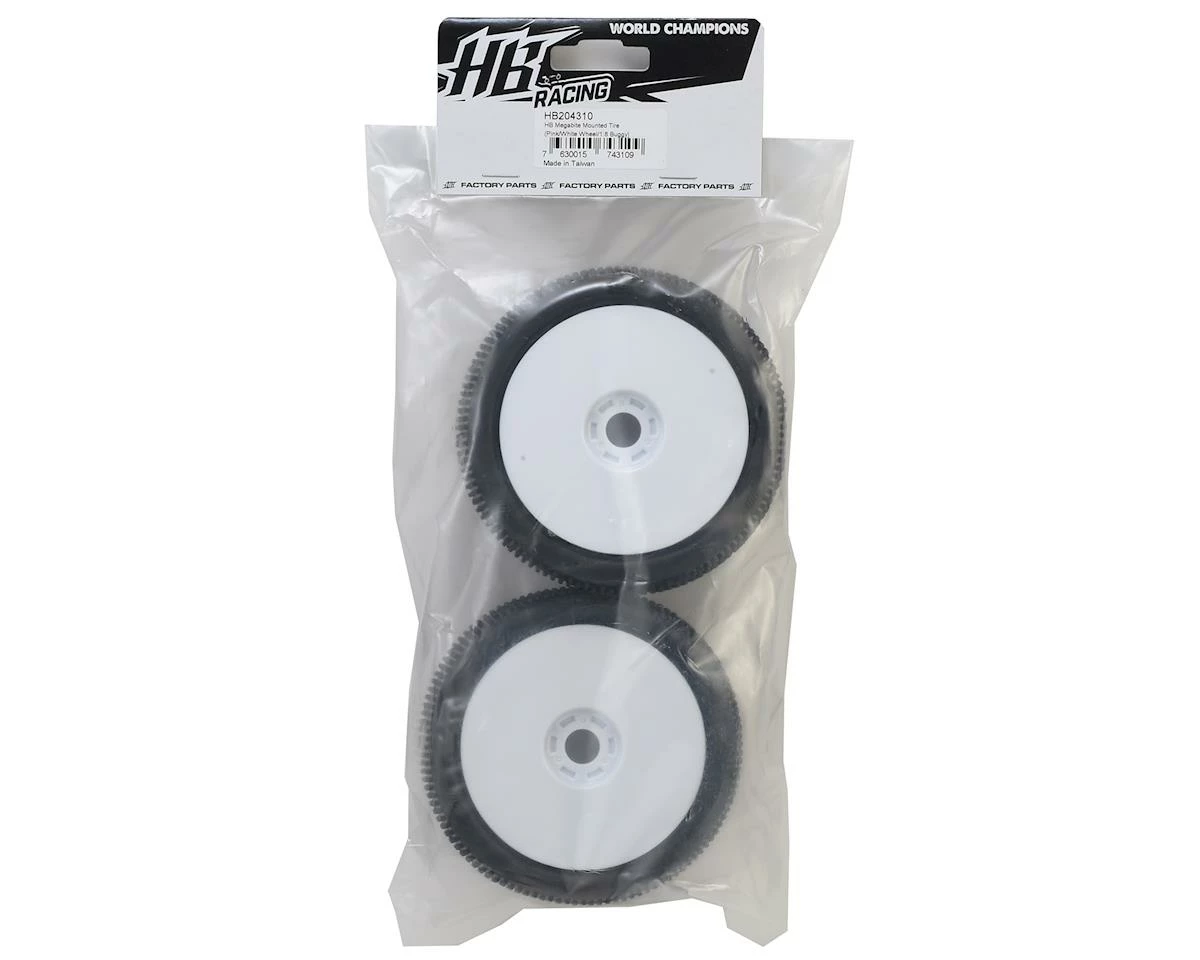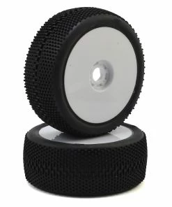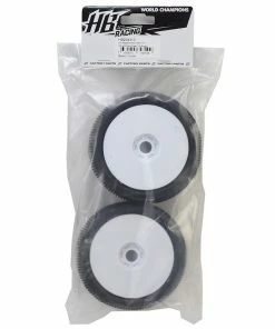 This is a set of two Hot Bodies Megabite 1/8 Buggy Tires. These tires are pre-mounted on white dish wheels. Hot Bodies Megabite tires are fantastic mini-pin tires that are suitable for hard & dry off-road surfaces such as hard-packed clay (including ‘blue groove’), light dust conditions, and regular clay.