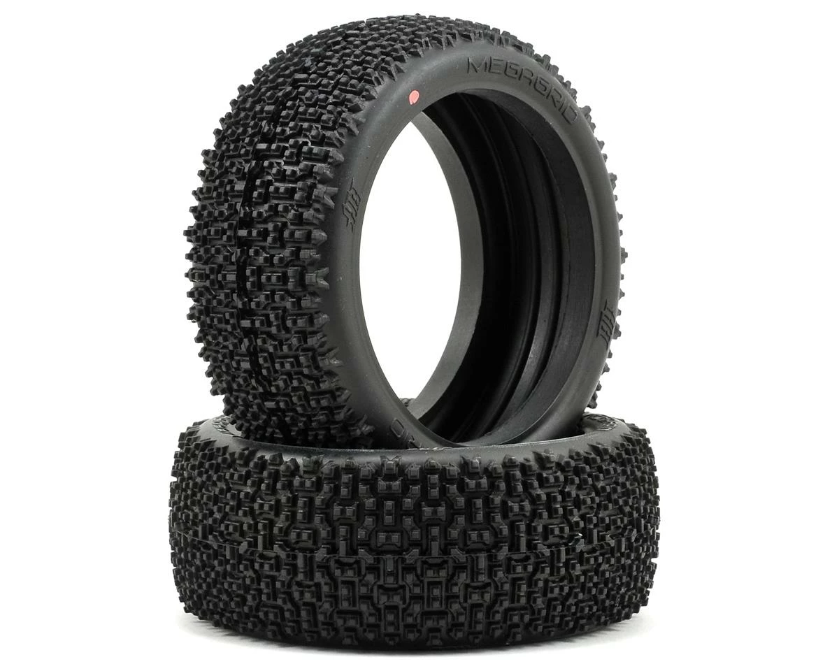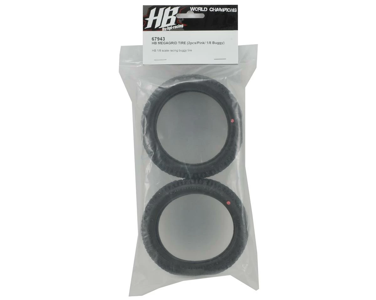 This is a set of two Hot Bodies Megagrid 1/8 Buggy Tires. HB Megagrid tires are suitable for a wide variety of off-road and on-road surfaces including loose topsoil right on down to hard-pack. This is HB’s most versatile tire and should be used when you go to a new track because it will be a good starting point everywhere.