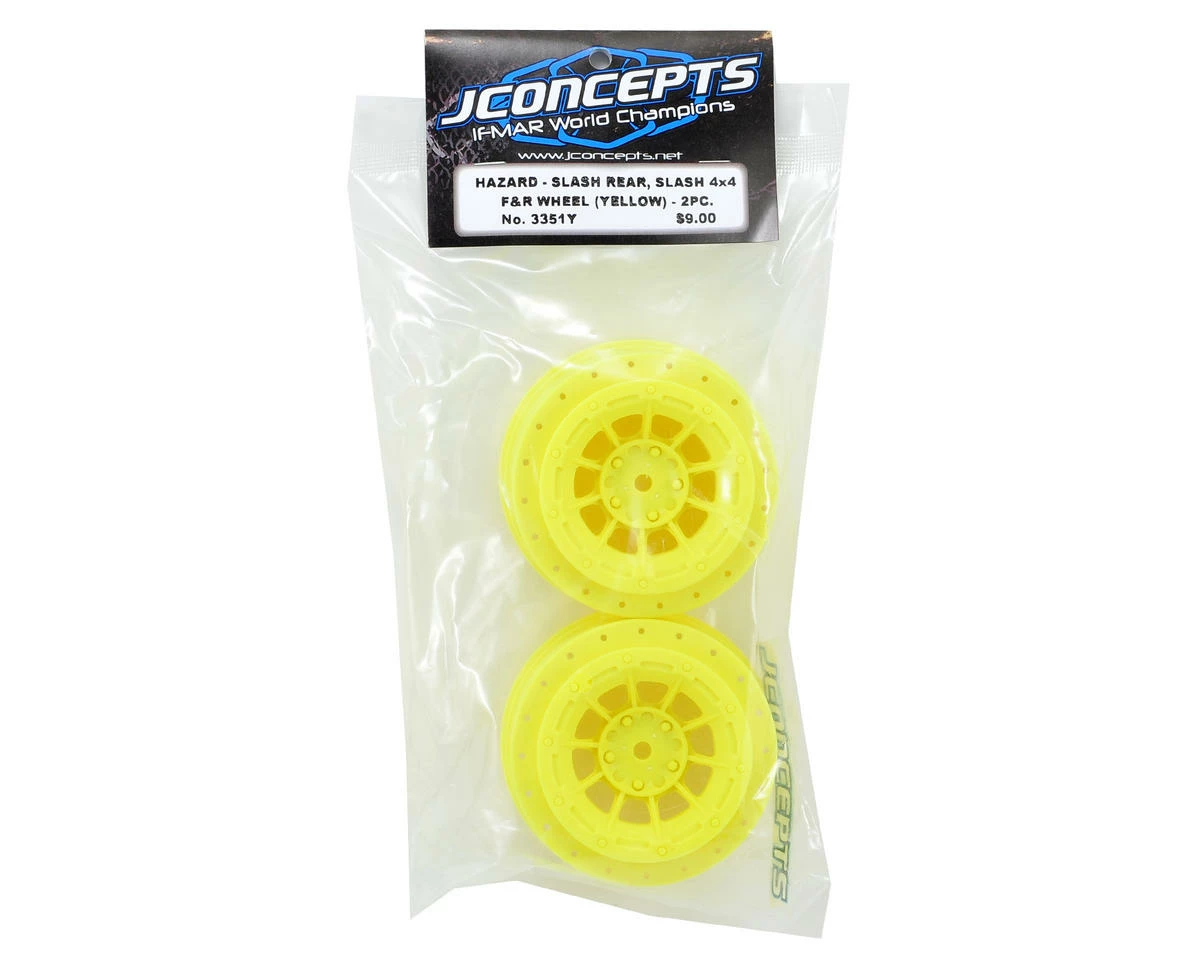 This is a set of two JConcepts Hazard Wheels, and are intended for use on the rear of the Traxxas Slash, as well as the front and rear of the Slash 4×4. Short Course trucks have evolved into high-performance racing vehicles and adjustability is always the key to success. The Hazard 12mm hex wheel for the Traxxas Slash and Slash 4×4 has a powerful look that combines the winning combination of a 10 spoke design, bead-lock appearance and center lug nut detail with a hint of inspiration from yesteryear. Already a champion, the Hazard wheel earned the top qualifying position and 1st place at the 2011 ROAR Off-Road Nationals in the Pro 2 modified class in the hands of Ryan Maifield. A dominating performance taking the TQ in the first 3 rounds of qualifying and 1st place in A1 and A2 to retain the title for JConcepts.