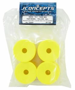 This is a set of four JConcepts Mono 12mm Hex Wheels, and are intended for use with the Team Associated T4.1 1/10 scale stadium truck equipped with the optional 12mm hex conversion. For many years the standard option on the Team Associated 1/10th truck has been a proven bearing front wheel and pin-drive rear wheel setup. Times have changed, JConcepts – Mono 12mm hex wheels are the latest accessory available for the Team Associated T4.1 truck. Racers have asked for years for an interchangeable front and rear wheel on the T4 and JConcepts has delivered. With the recent release of the Team Associated 12mm hex conversion, converting to a more durable interchangeable wheel setup is easier than ever. JConcepts replacement wheels are designed in the popular dish style and available in white and fluorescent yellow.