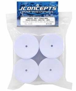 This is a set of four JConcepts Mono 12mm Hex 2.2 Rear Wheels, and are intended for use with the Associated B4.1, B44.1 and Kyosho RB5 1/10 buggies. For many years the standard setup on Team Associated 2wd vehicles has been a proven bearing front wheel and pin-drive rear wheel setup. Times have changed, and JConcepts – Mono 12mm hex wheels are the latest accessory available for the Team Associated B4.1 buggy. With the recent release of the Team Associated’s 12mm hex conversion, converting to a more durable interchangeable wheel setup is easier than ever. JConcepts replacement wheels are designed in the popular dish style and available in bright white and fluorescent yellow. When Team Associated makes an update, JConcepts delivers.