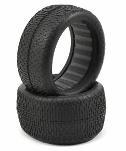This is a pack of two JConcepts Bar Flys 60mm Rear Buggy Tires. Starting with the Bar Code V1 tire, the design team at JConcepts has cut the height off the tread, added some additional surface area and blended in sidewall details to create the Bar Flys, a fresh take on the original low tread indoor racing tire. The team reduced the overall height and blended the tread to carcass with a generous radius. In-between the slotted bars, tiny Pressure Point size pins were added for increased surface area. The micro-height of the tread transitions out to the all important side-wall area where the team has maintained position of the original “Cactus” feature but have also positioned a V-joint feature to support the lateral load of high-speed circuits.Â