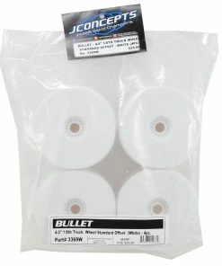 This is a pack of four JConcepts Bullet 4.0″ Standard Offset 1/8 Truck Wheels. At the heart of the design is the 4.0” height bead which is has become standard for the 1/8th truck class. Leaving no detail untouched, the flat bead configuration provides elements that combine light-weight with performance. Utilizing an updated tire mounting bead, the 4.0” design eliminates the need for excess rubber and insert material, dropping overall weight, while simplifying the mounting / gluing contact patch and location. Available in bright white and fluorescent yellow the Bullet 4.0” wheel is manufactured in a durable material which is able to withstand the heavy rigors of 1/8th truck racing. The Bullet wheels also incorporate a user friendly wheel face shaped to promote a smoother gluing, wiping and drying experience.
