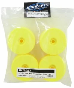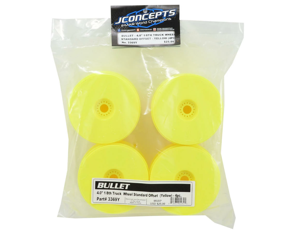 This is a pack of four JConcepts Bullet 4.0″ Standard Offset 1/8 Truck Wheels. At the heart of the design is the 4.0” height bead which is has become standard for the 1/8th truck class. Leaving no detail untouched, the flat bead configuration provides elements that combine light-weight with performance. Utilizing an updated tire mounting bead, the 4.0” design eliminates the need for excess rubber and insert material, dropping overall weight, while simplifying the mounting / gluing contact patch and location. Available in bright white and fluorescent yellow the Bullet 4.0” wheel is manufactured in a durable material which is able to withstand the heavy rigors of 1/8th truck racing. The Bullet wheels also incorporate a user friendly wheel face shaped to promote a smoother gluing, wiping and drying experience.