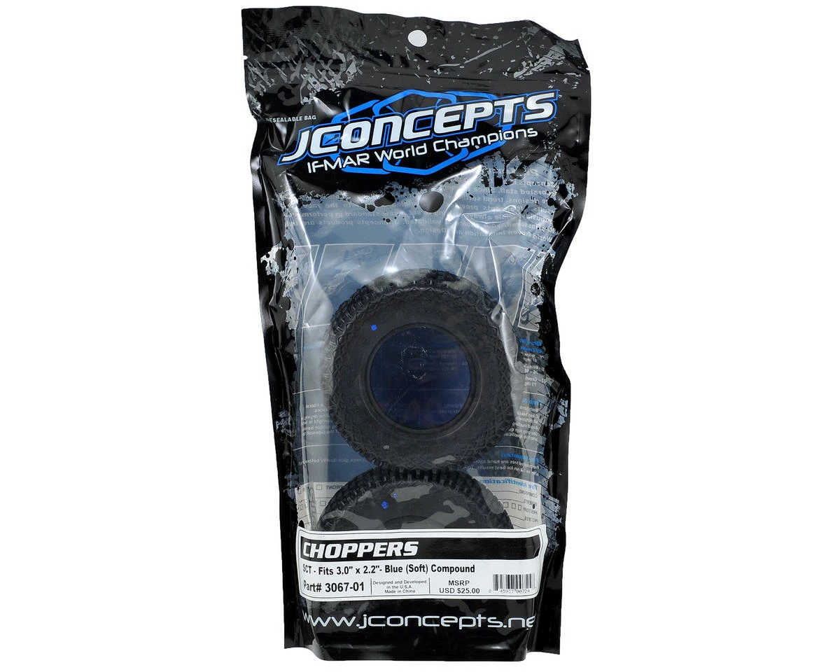 This is a set of two JConcepts Choppers Short Course Tires. After the racing success of the JConcepts Short Course tires and accessories, drivers have asked for an all-terrain alternative aimed toward high-end bashing performance. Inspired from some of the most successful JConcepts Racing Tires, the Choppers have the look, fit and finish of a hard-core racing tire on steroids. Whether you are an experienced racer or beginning driver, the Choppers in blue compound are designed to tear up surfaces ranging from grass and gravel to dirt and asphalt.