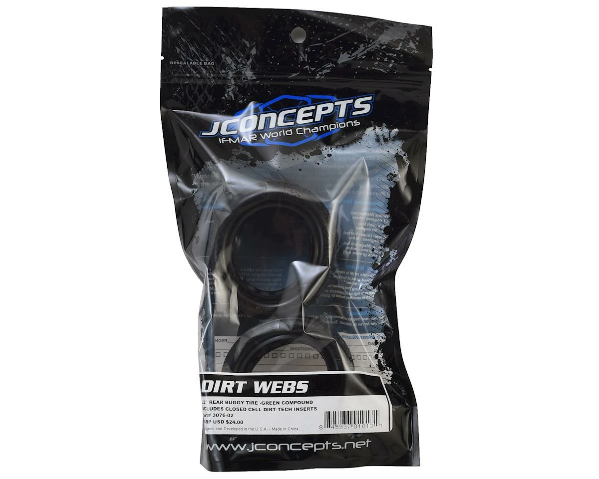 This is a pack of two JConcepts Dirt Webs 2.2″ Rear Buggy Tires. During 2012, legendary tire builder, Brian Kinwald, came up with a hand-made tire design. After testing at indoor tracks around the country, qualifying results during the 2012 Hot Rod Shootout and working together with JConcepts designer Jason Ruona, the Dirt Webs tire was born. Production tire versions debuted during the 2013 IFMAR World Championships at Silver Dollar Raceway in Chico, CA, where Ryan Maifield used the front tire to his advantage during the A-Final events taking the fastest lap times on his way to a 3rd overall podium finish in the 2wd class.