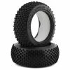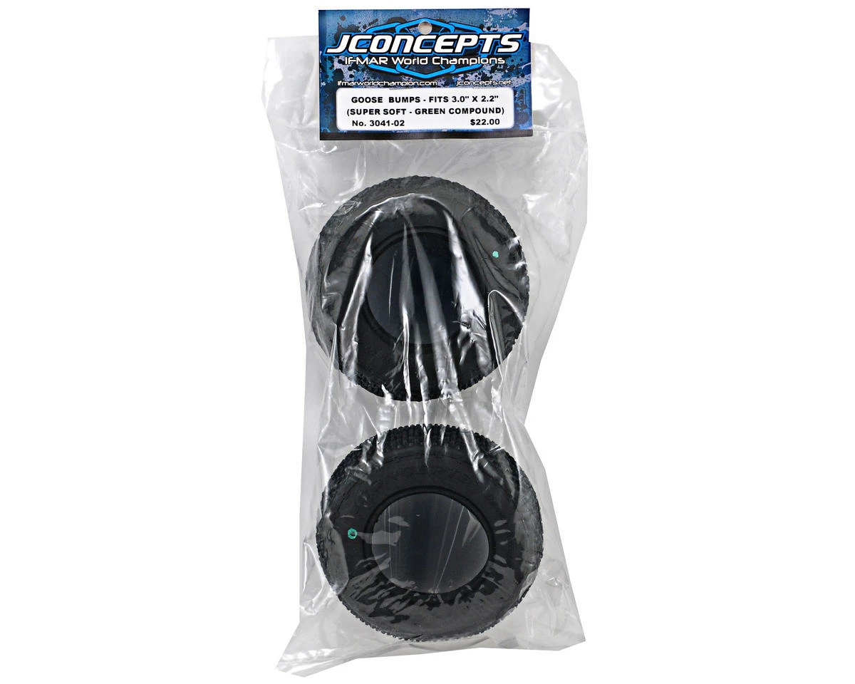 This is a set of two JConcepts Goose Bumps Short Course Tires. Short Course racing has progressed and JConcepts is on top of the development with the introduction of the Goose Bumps. Realism has not been left out on these race tires, the Goose Bumps are completely detailed with center lug all-terrain inspired tread and side wall. The JConcepts Goose Bumps tires are just what the doctor ordered; combining a totally unique step pin and bar lug design with sticky green compound to allow even greater control on off-road surfaces.