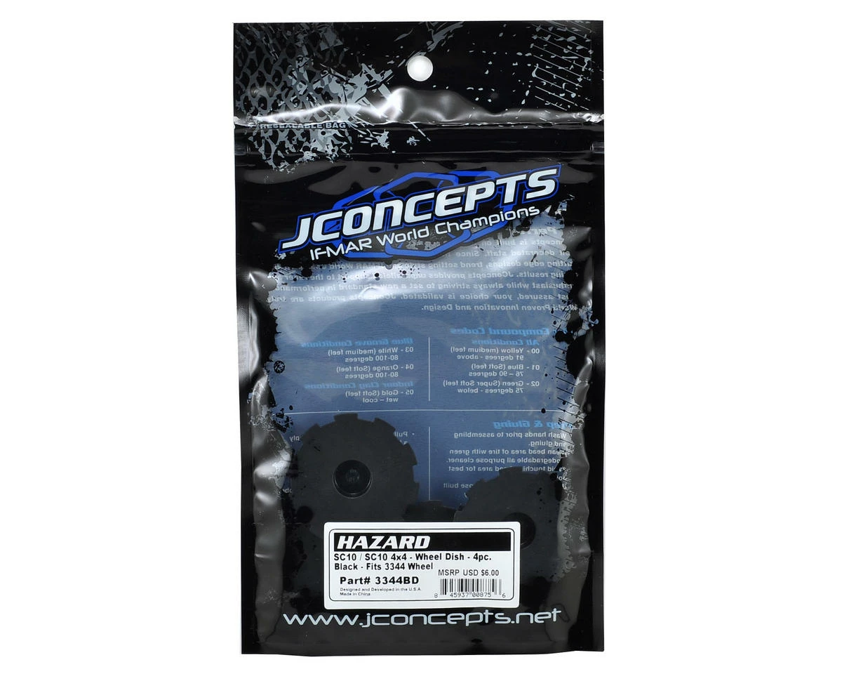 This is a pack of four JConcepts Hazard Wheel Dishes, and are intended for use with the JConcepts Hazard TEN-SCTE wheel. With advancements and perspective changing within the Short Course Class and driver preferences focusing more exclusively on performance, JConcepts has added a much anticipated accessory to their short course line-up. The wheel dish can add a personal touch or more focused driven setup tweak to the popular Hazard wheel. The wheel dish is injection molded plastic and features built-in geometry to engage into the Hazard wheel and provide that dish wheel style with minimal effort. The wheel dish is cleverly designed to secure to the wheel and clamps into place when you tighten down the wheel nut. Perfect style, perfect flexibility, JConcepts.