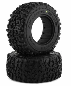 The flexibility and strength of the yellow compound combined with the lug arrangement gives the tire a grippy feel but still maintains an all-important scale and performance look. The overall height provides plenty of ground clearance for an abundance of terrain and bossed side-wall logos read with beauty and balance. The tires include a closed cell insert capable of standing up to the compound but flexible enough for sharp terrain.