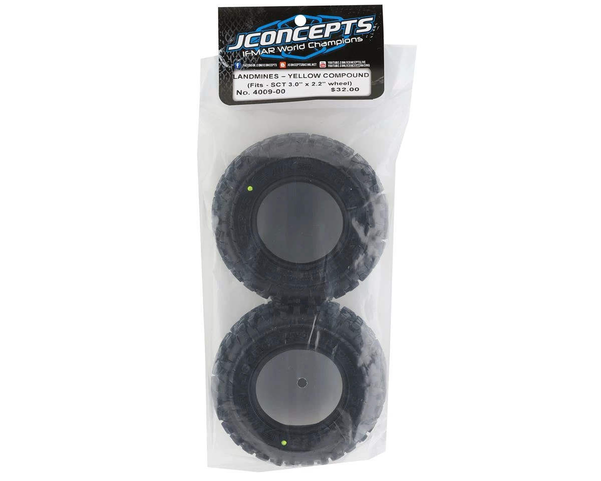 The JConcepts Landmines Short Course Tires have been designed for outstanding all-terrain performance. The Landmines, developed over a 2-year period of testing, tuning and analysis have reached the summit and now available to the SCT enthusiast. The design starts with a robust carcass carefully shaped and sized for a multitude of conditions and capable of driving over a variety of terrain while being down-to-earth enough to carry a scale appearance.