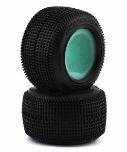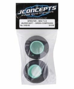 This is a pair of JConcepts Mini-T Sprinter Off-Road Tires in Green super soft rubber compound. The Sprinter tire has square, angled pins that are stacked vertically to flex and fold evenly across the tire. Typically, a stacked tread will wear less and provide more forward bite while the aligned space helps rotation in the turns and gives a snappy release to square up quickly. Starting with the tread, the team focused on durability and performance to bring a rear tire option to market that competes on loose surfaces which are wet or dusty.