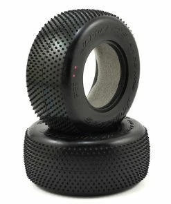 JConcepts Pin Downs Carpet Short Course Tires feature a pin spiked tread, which is directional for added performance and stability. The directional nature of the pins were positioned to allow broken-in type pins to grip the surface in one direction, while the pins are more upright when oriented in the opposite direction. The bottoms of the pins have heavy radiuses which allow the pins to wear more consistently and not tear or rip off the carcass prematurely. The tires are designed for the industry standard SCT wheels, available from JConcepts (JCO3344 – AE; JCO3352 – TLR).