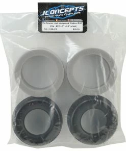 The tire carcass itself has been refined to reduce weight while maintaining strong sidewall support. The pink compound marked with 2 pink dots on the tire represents a new compound for JConcepts, a medium soft material with good wear characteristics. The rear tires include gray, open cell inserts making them a complete set ready to mount, straight out of the package. The Pin Downs work best on Carpet and Astroturf tracks where typically a small pin tire is working.