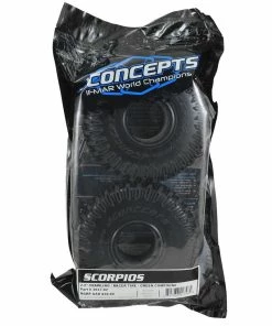 This is a pack of two JConcepts Scorpios 2.2″ Rock Crawler Tires. Ideal for vehicles like the Axial Yeti, the Scorpios feature scale looking tread, extra tall size (152mm) and profile. Starting by analyzing the tread, the design team focused on a closely knit tread arranging them in a pattern closely resembling a 1:1 scale tire. The padded arrangement of tread makes the tire ideal for transitioning from the hard road to dirt and then into rocky and uneven terrain. Once power is applied to the vehicle, the tread spacing opens up which allows for some deep digging making it a great working tire in dirt and muddy conditions.