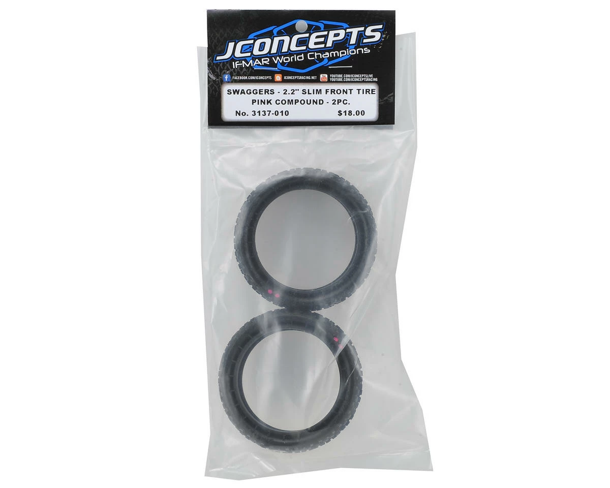 JConcepts Swaggers Carpet 2.2″ 2WD Front Buggy Tires have a multitude of heights and angular ribs for corning speed, consistency and straight-line tracking ability. The Swagger has shown to produce ultra fast lap times while also being easier to drive than other options on the market. The front tires are designed for the narrow “slim” style front wheels which are already available from JConcepts with part numbers JCO3376W or JCO3376Y.