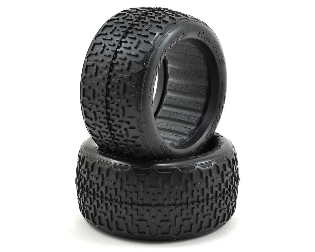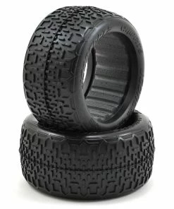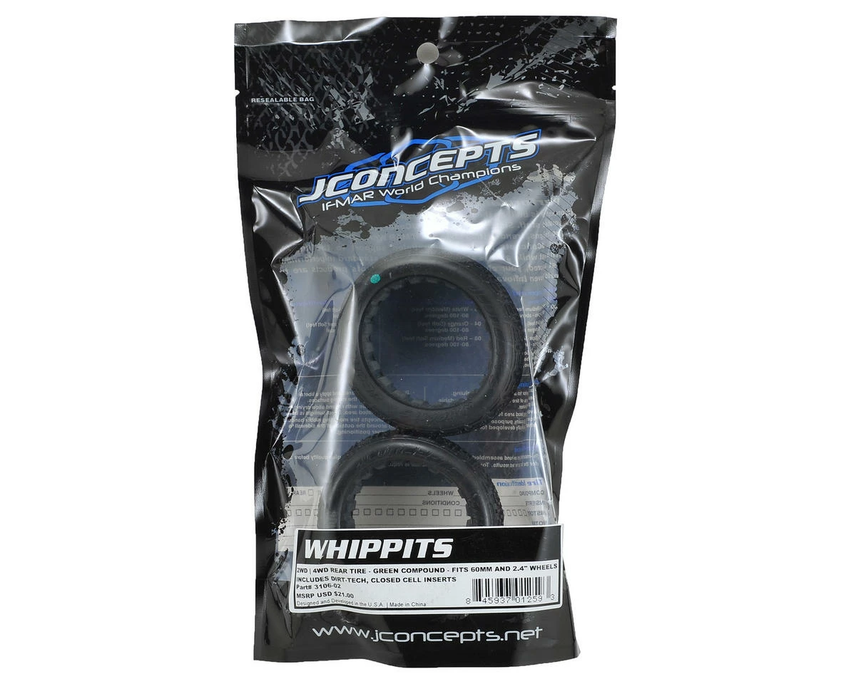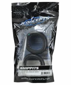 This is a pair of JConcepts Whippits 60mm Rear Buggy Tires. The outdoor racing scene has a new off-road tire, the Whippits. Built on the 60mm bead size carcass, the Whippits are fresh from the JConcepts design team. Starting with a sit-down meeting with racing legend Brian “Dirt” Kinwald, Jason Ruona went to work creating a beefier bar tire capable of conquering the outdoor blue groove, black groove and sugar type surfaces. The Whippits feature the 45 degree edging Kinwald asked for with light detail separating the pins as a noticeable top and bottom layer.