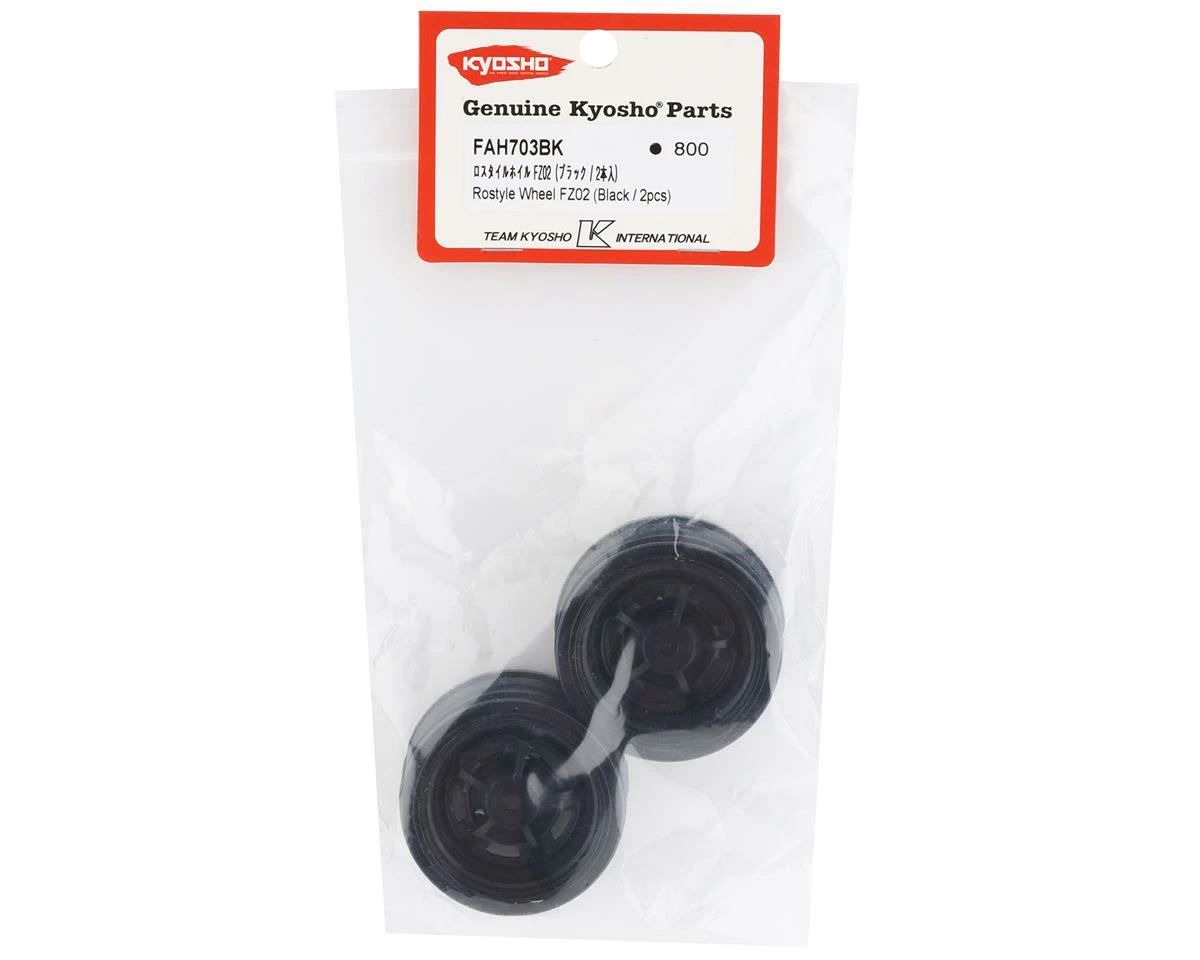 Kyosho Fazer Rostyle Sedan Wheels. These optional Rostyle sedan wheels are intended to fit the Kyosho Fazer touring car. Package includes two black Kyosho Fazer Rostyle sedan wheels