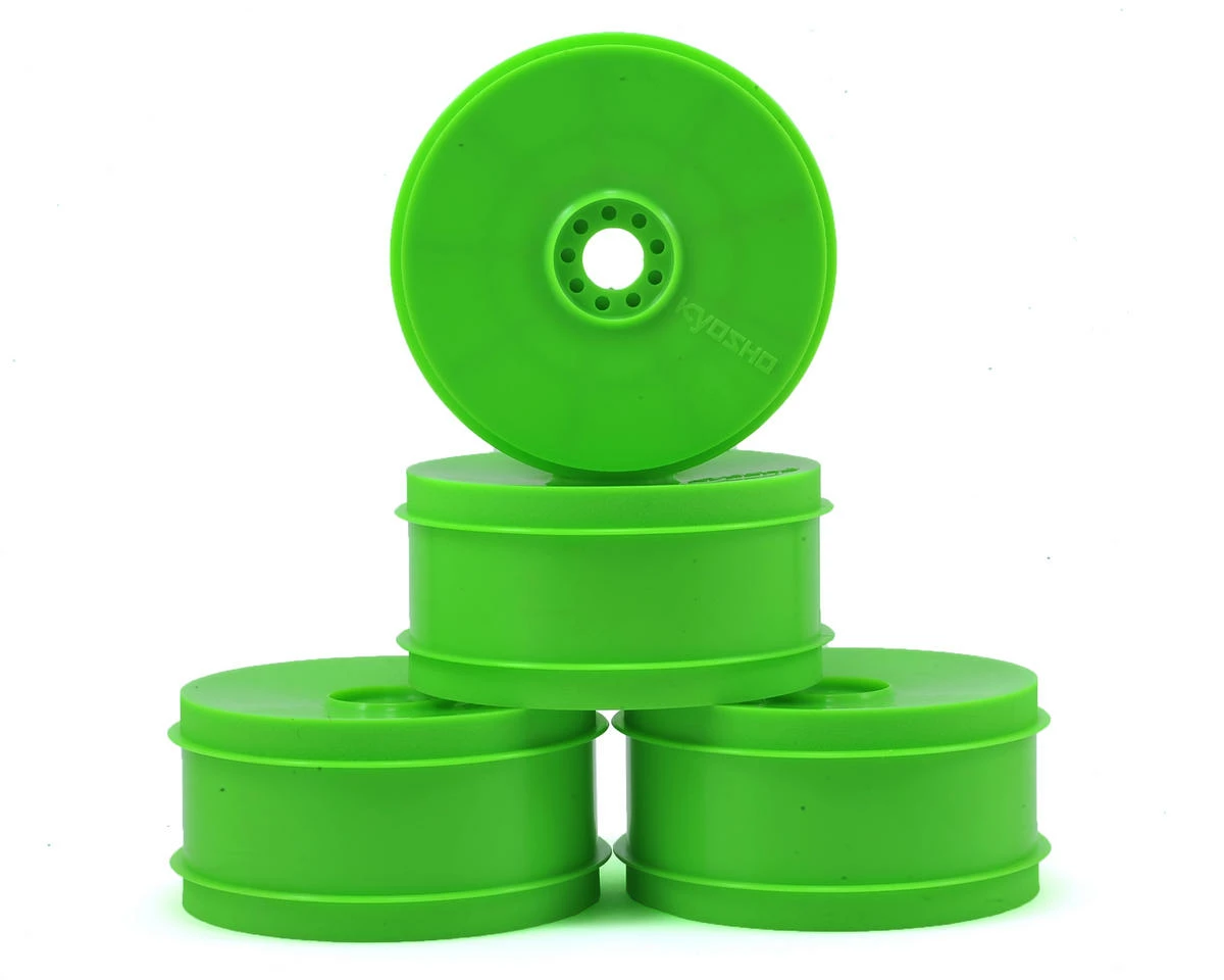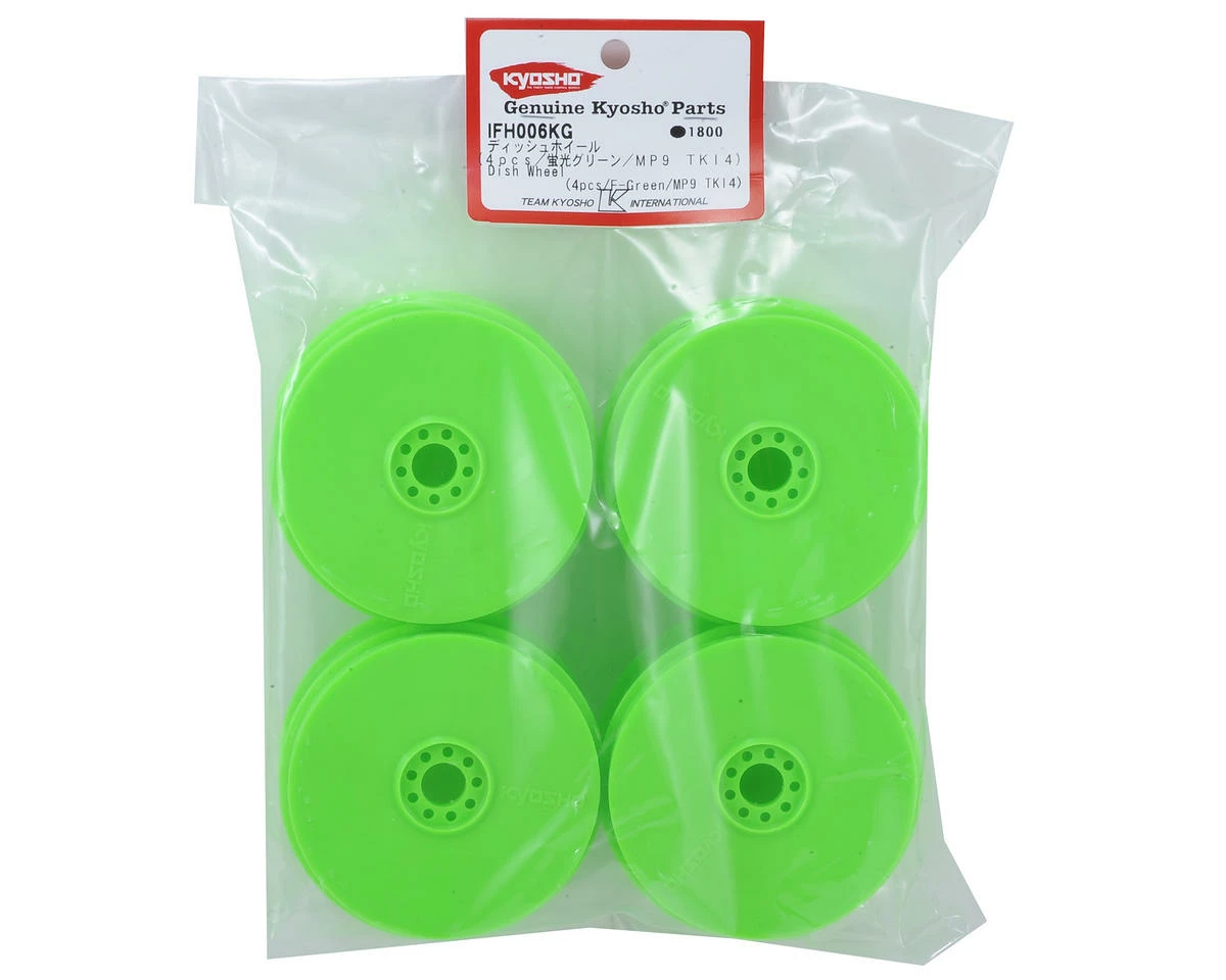 Kyosho MP9 TKI4 1/8th Off Road Dish Wheels are available in a variety of colors. But these wheels offer more than just color options. They are lighter than before, and have a textured gluing surface that provides a more secure bond between the wheel and tire. Plus, they are lighter than the previous Kyosho wheel to reduce rotating mass and improve acceleration.Â