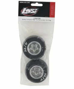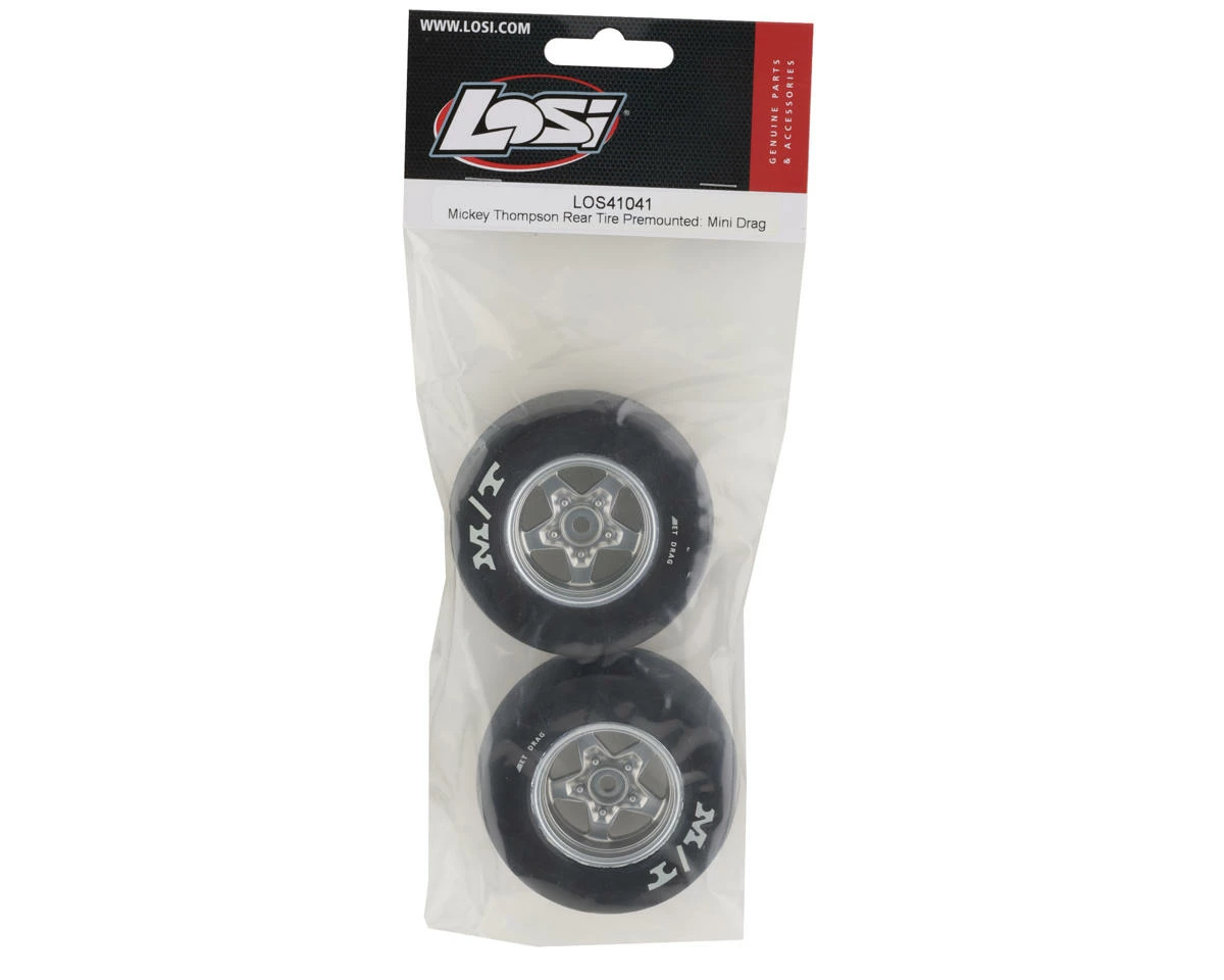 Losi 1/16 Mini Drag Pre-Mounted Mickey Thompson Tires with 8mm Hex. These replacement rear tires are intended for the Losi 1/16 Mini Drag Car. Made from a soft compound, these tires are pre-mounted for ease of use. Package includes two rear tires.