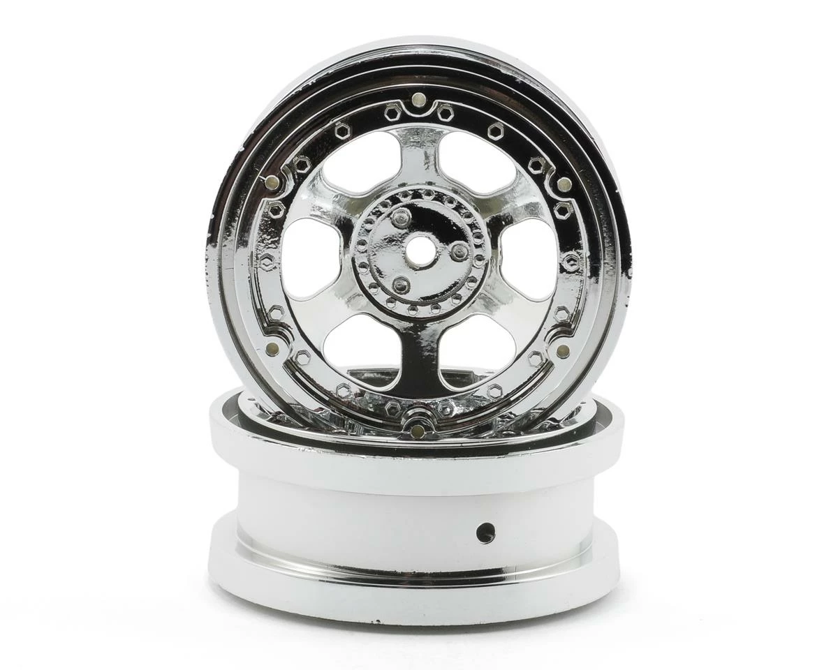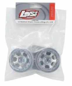 This is a set of two replacement Losi Chrome 2.2″ Bead Lock Wheels with rings, and are intended for use with the Losi 1/10 Comp Rock Crawler.