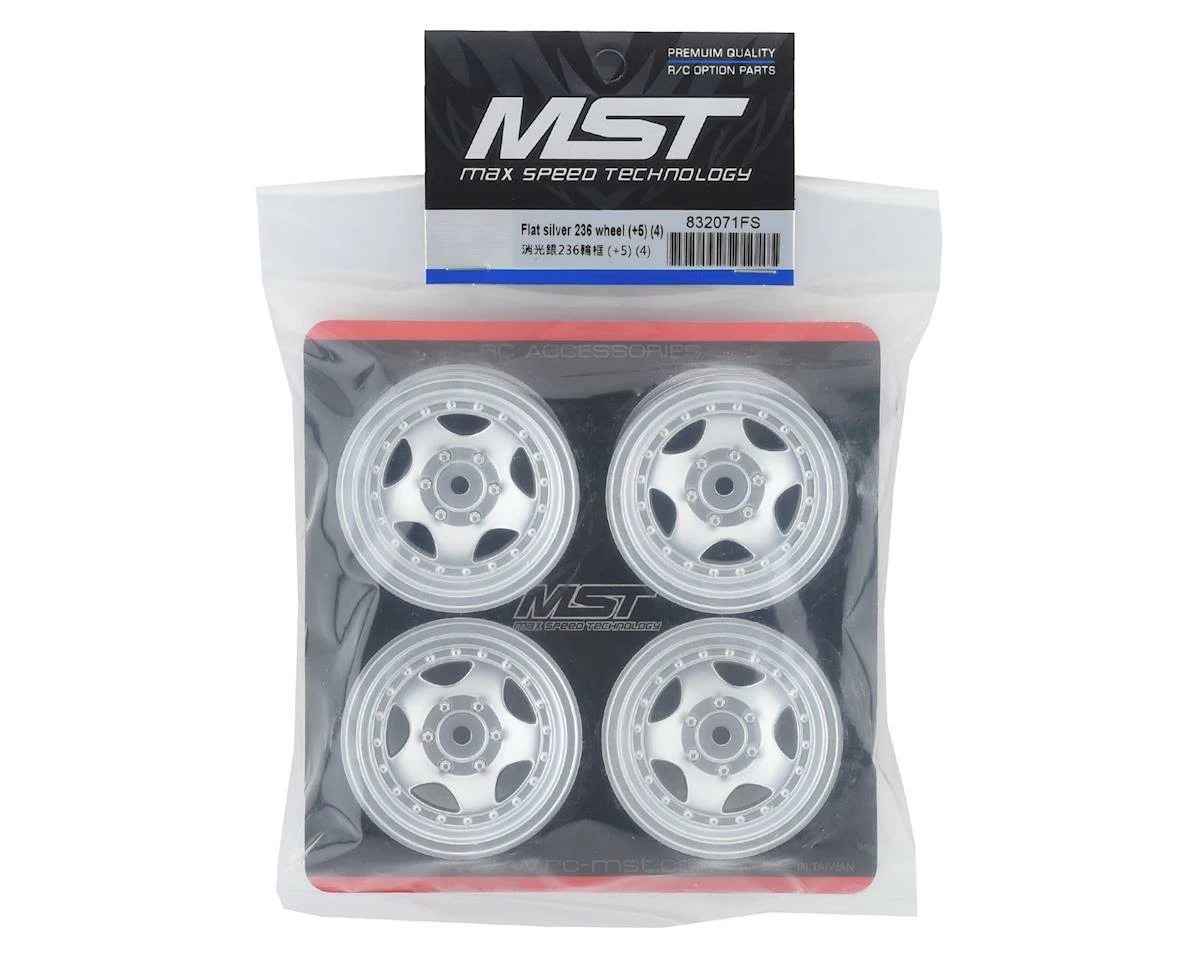 The MST 236 1.9″ Crawler Wheel is a classic 5 spoke D-hole style wheel design, with modeled in 6 lug bolt details. These glue type wheels are pre-vented, measure 26mm wide and offer a +5mm offset. Package includes four wheels and a set of four serrated wheel nuts.Â