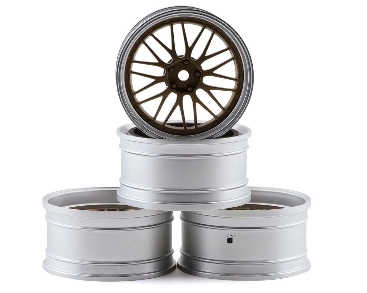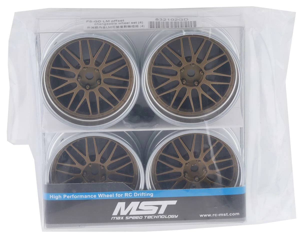MST FS-GD LM Offset Changeable Wheel Set. These wheels feature an aggressive Y-spoke pattern and molded in bolt details. The design allows you to setup the wheel with a +3, +5, +7 or +9 offset to fit a variety of bodies, and setup the stance to create the look you want on your ride. Simply clock the wheel face inside the rim and glue in place. Package includes four wheels and four serrated wheel nuts.Â