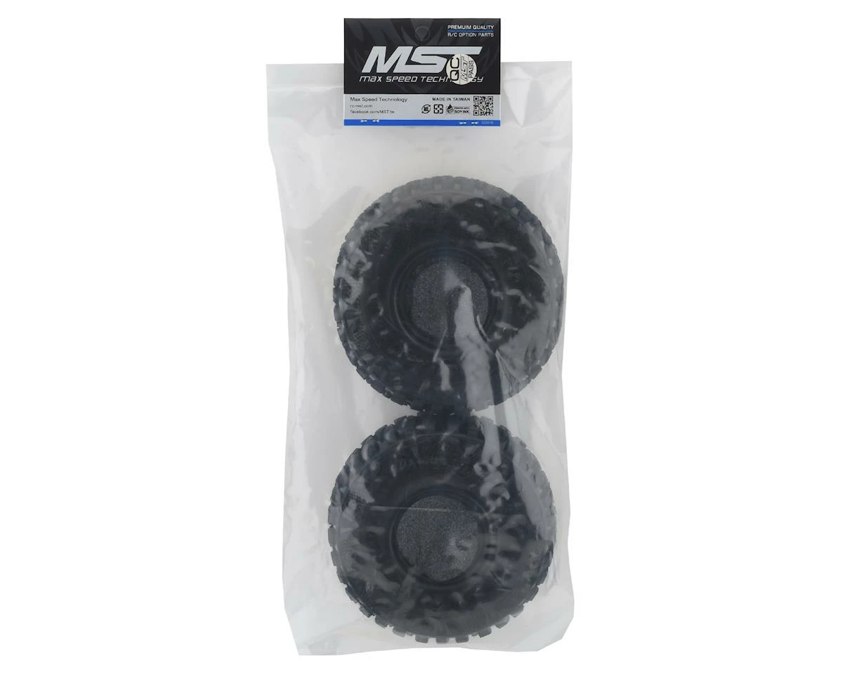 This is a set of two MST MG 1.9″ Crawler Tires. These tires are included with the MST CFX-W and measure 40mm wide, with a 120mm (4.7″) outer diameter. While these tires are not officially licensed, they are scale replicas of the Nitto Mud Grappler Extreme tire. These tires work well and provide a great option for people looking to put something a little different on their next scale build. Available in soft and medium compounds. Package includes two tires and foam inserts.