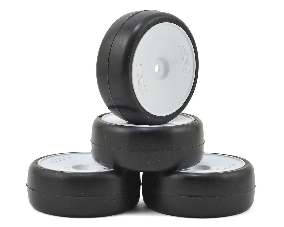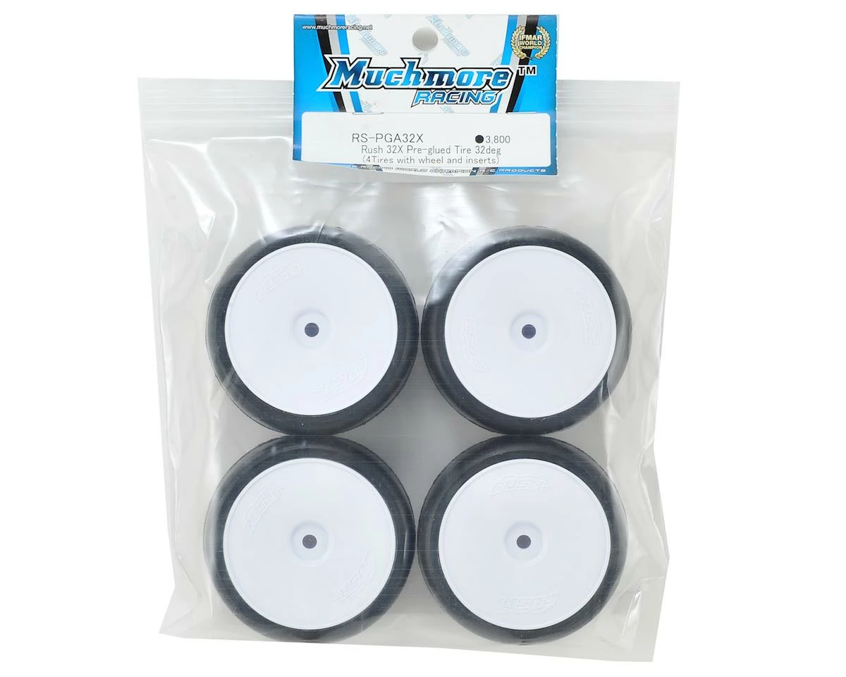 Muchmore Racing Rush Pre-Glued Touring Car Tires are precision mounted with high quality inserts on Muchmore Rush wheels. These are a great choice for handout tires for spec racing, as well as for general race use. Choose from 32 or 36 shore rubber compounds. Â