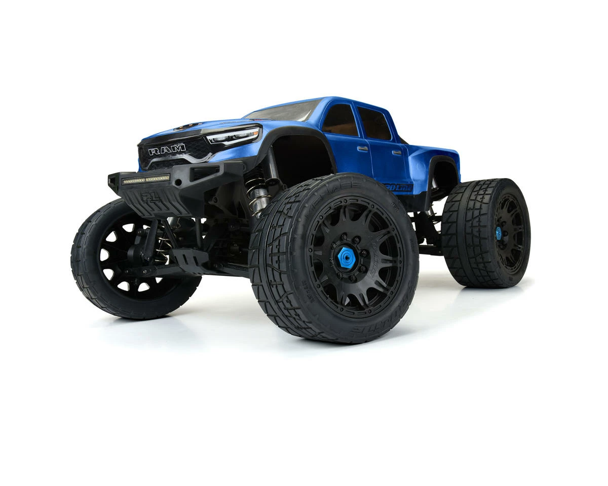 Pro-Line 1/6 Menace HP Belted Pre-Mounted 8S Monster Truck Tires. The Menace HP tires are mounted on Raid 5.7″ Wheels! The 1:1 racing-inspired treads are designed to give your rig massive traction on your street, parking lot, or track. Belted tires mean no ballooning allowing the tires to hold their shape, even at high speeds. Pre-mounted to Raid wheels, these tires are ready to give you a great all-around bashing experience.