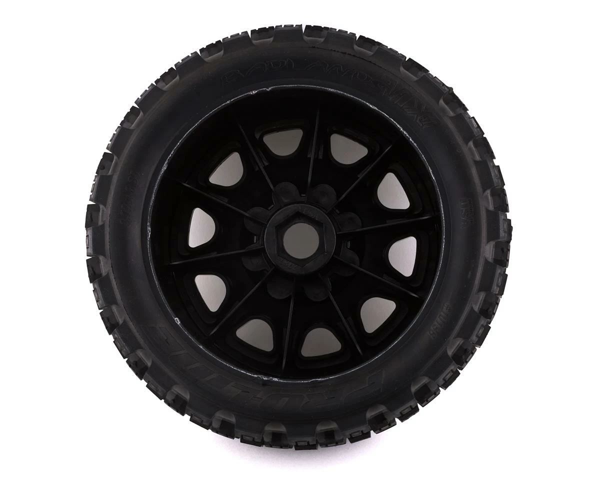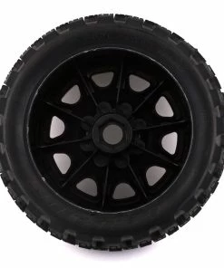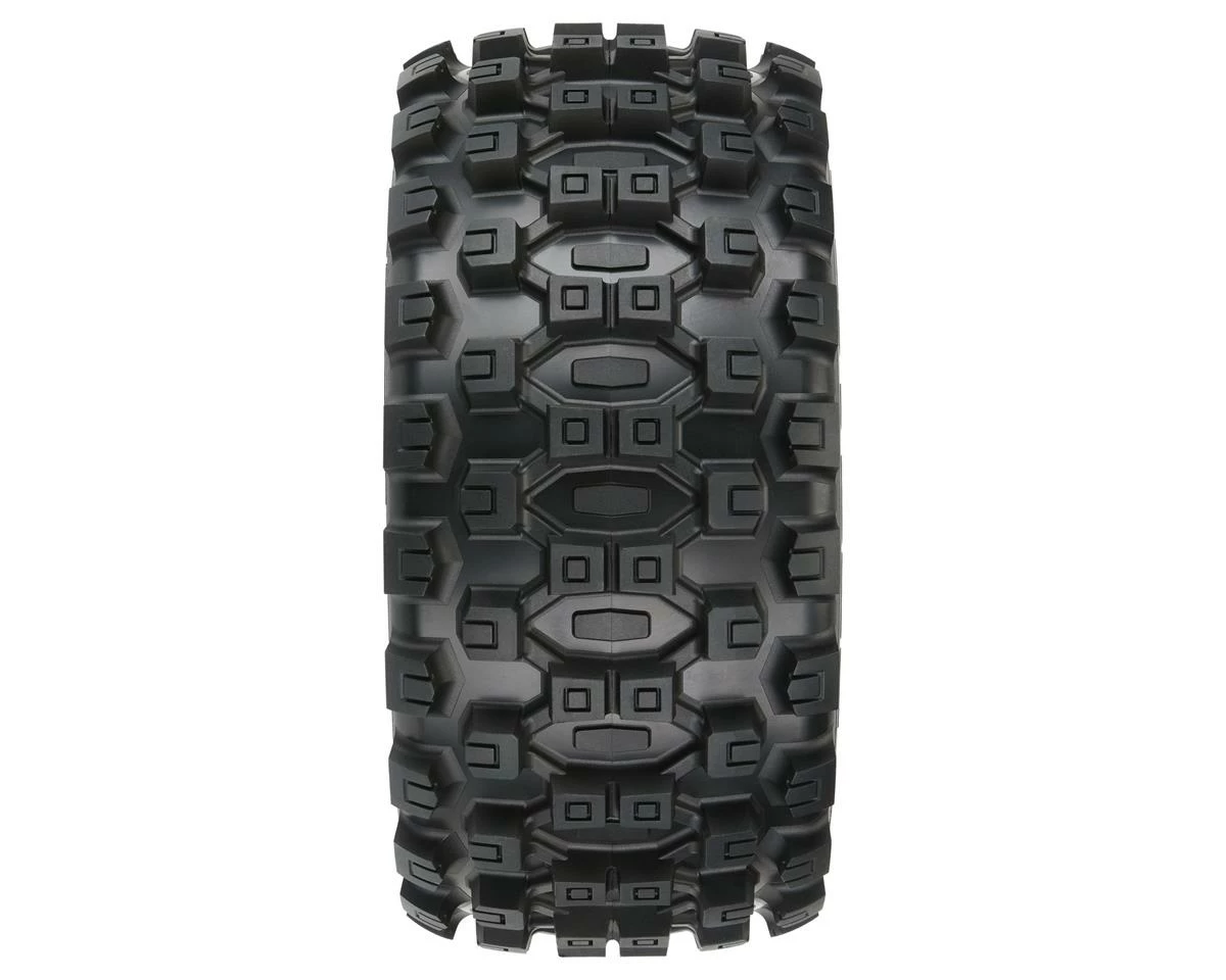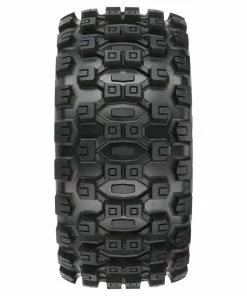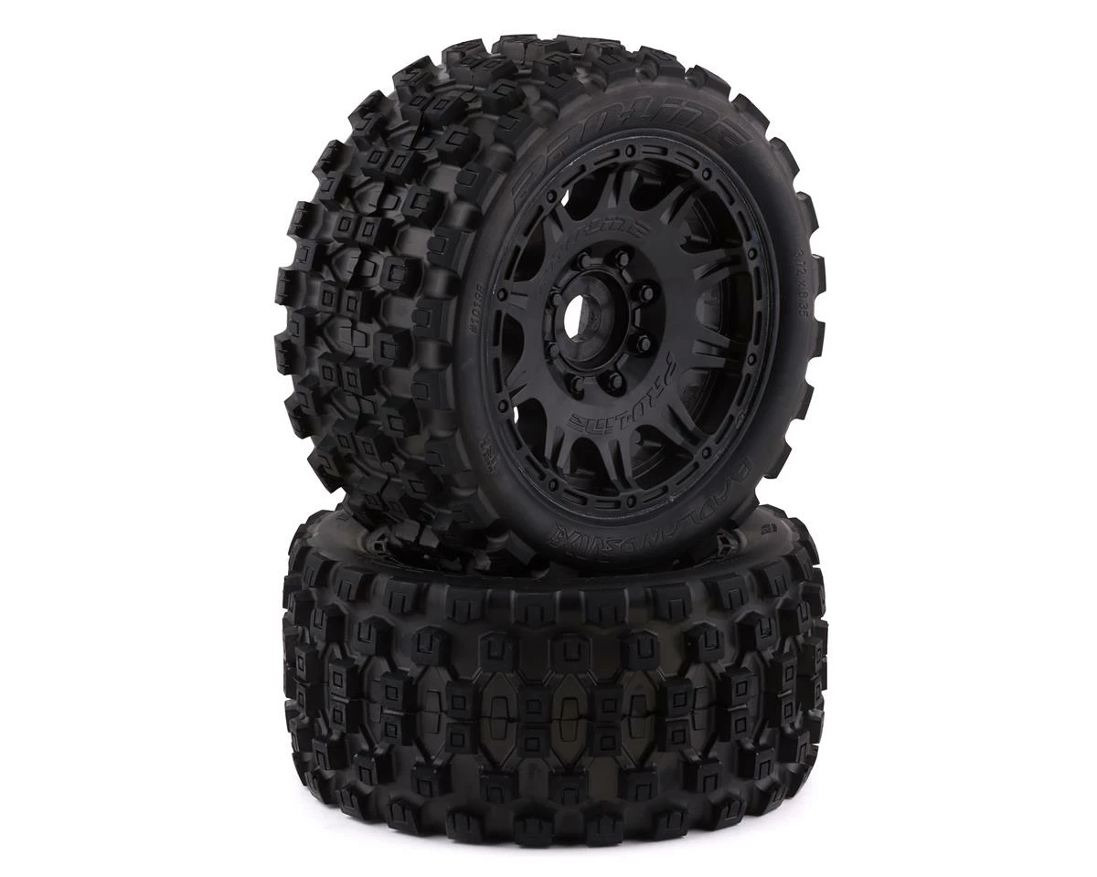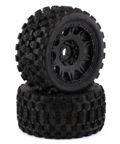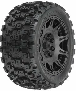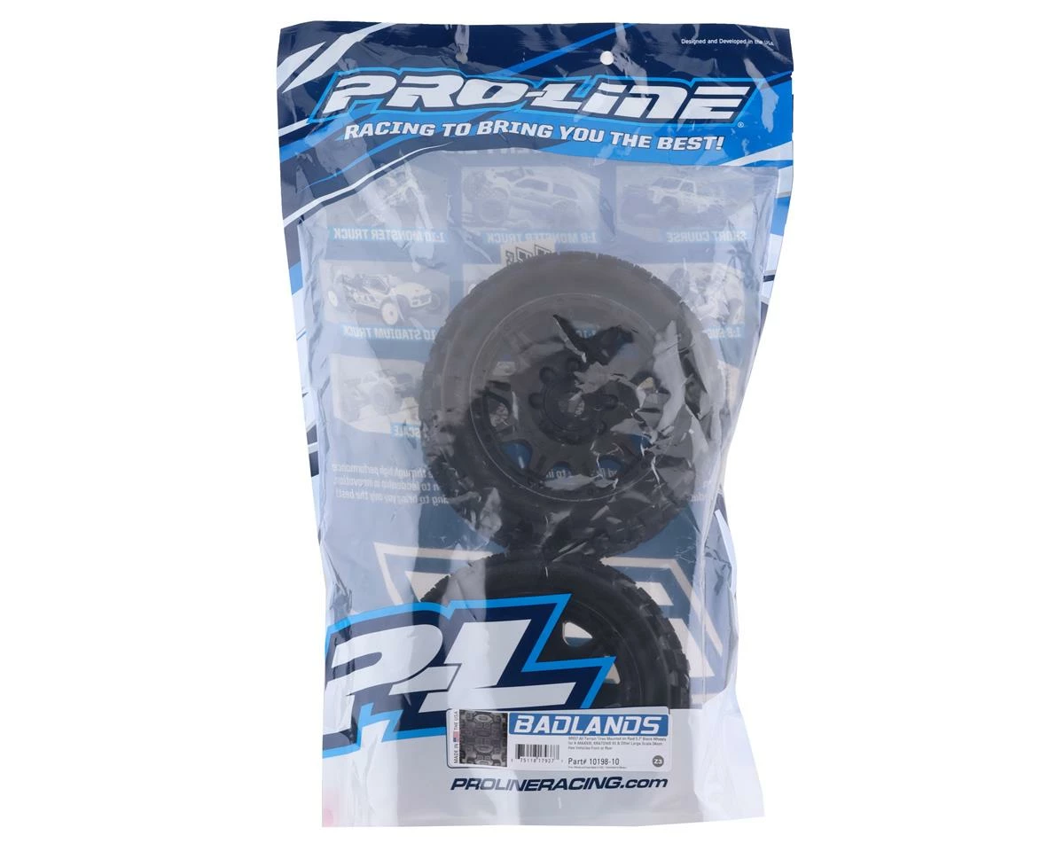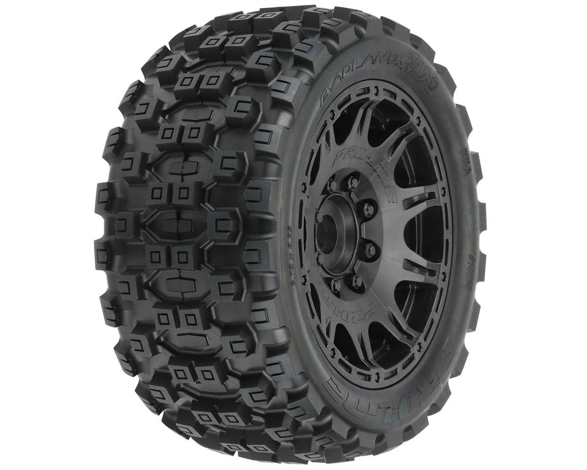 Pro-Line Badlands MX57 5.7″ Pre-Mounted 1/6 Monster Truck Tires with Raid Wheels. These Badlands are based on the MX43 tire and features the same aggressive tread combination. Now mounted on the Raid wheels, these tire and wheels weigh 20% less than prior models. Pro-Line Badlands tires are known for having a sweet Motocross inspired tread and the Badlands MX57 tires kick that up a notch with a Bigger and Bolder knobby tread that matches modern MX tire design.