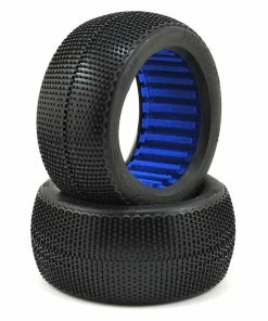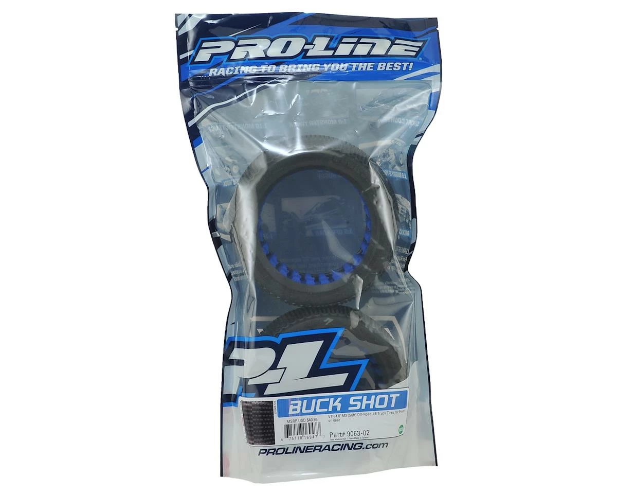 The Pro-Line Buck Shot VTR 4.0″ 1/8 Truggy Tire has pins that are very close in size to the Hole Shot 2.0 but the Buck Shot pins are stacked closer together side to side, which provides significantly longer lasting performance. Unique to the Buck Shot are the alternating elongated bars that provide incredible forward grip! Similar to the SwitchBlade tire, the Buck Shot is a directional tire with different tread on the outside compared to the inside, allowing you to mount the tires in the direction that suits your current track conditions. One side of the tire has standard pins, which is ideal for loose or low traction conditions where you want the tire to add side grip and improve steering. When you mount the tire the other direction, the connected side tread (Blade) reduces side traction in high-bite or edgy conditions.
