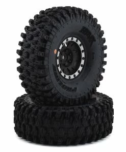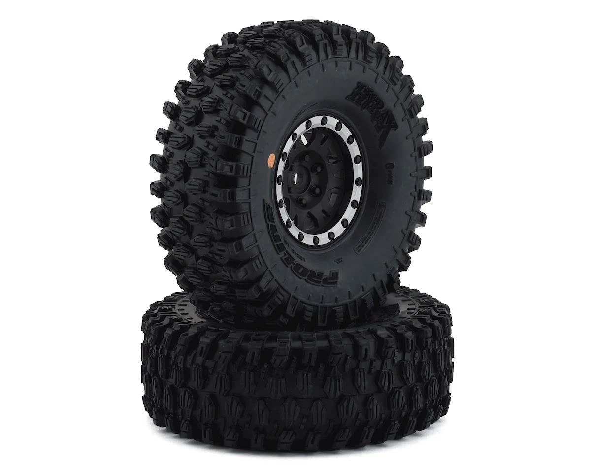 Pro-Line Hyrax 1.9″ Tires are now available mounted on Impulse Black/Silver internal Bead-Loc wheels. Designed for maximum grip on the toughest terrain, the Hyrax tire is ready for anything your Scale Adventure might throw at you. The Hyrax features an aggressive and open tread pattern with each tread block containing multiple Sipes for incredible tread flex. The highly detailed connected tread on the sidewall of the Hyrax extends out for unmatched side-hilling performance. The Hyrax also features futuristic stepped tread blocks that create even more forward gripping edges that dig into slick rock like no other scale tire Pro-Line has produced to date! The Hyrax is available in either the legendary G8 material or the super soft Predator compounds.