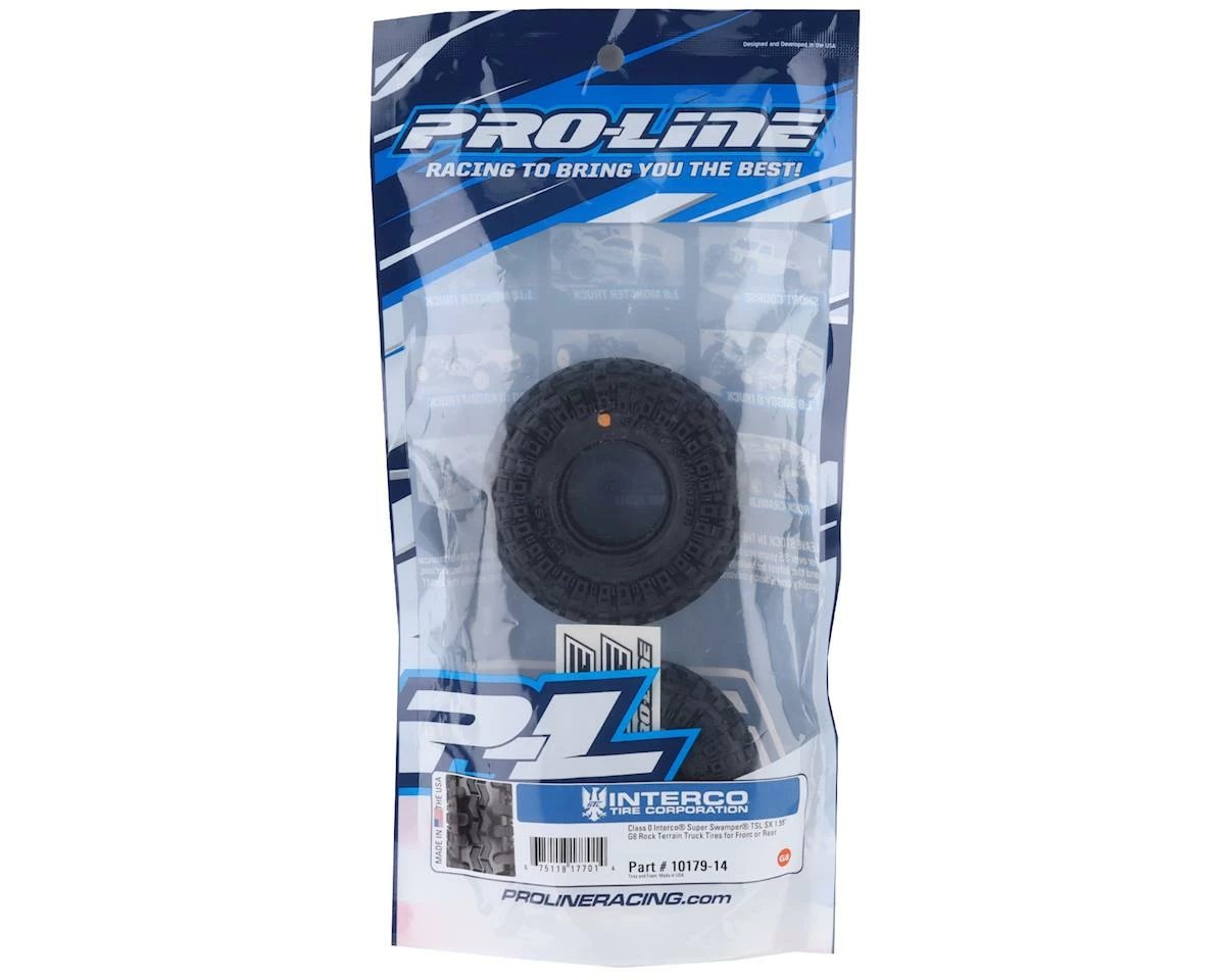 The full-size Super Swamper TSL SX features the ultimate tire tread design by pairing the distinctive chevron tread pattern with the famous, trademarked, and patented Interco TSL (three-stage lug) tread design. TSL is a lug pattern with short, intermediate, and long lugs that are each uniquely arranged, proportioned and spaced which allow them to bite quickly and self-clean rapidly. Each of these details has been faithfully recreated in Class 0 size to fit your 1.55″ wheel. Just like the full-size Interco Super Swamper TSL SX tires, Pro-Line tires are proudly Made in the USA.Â