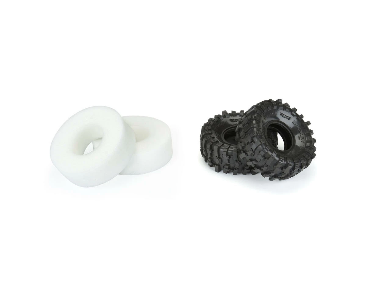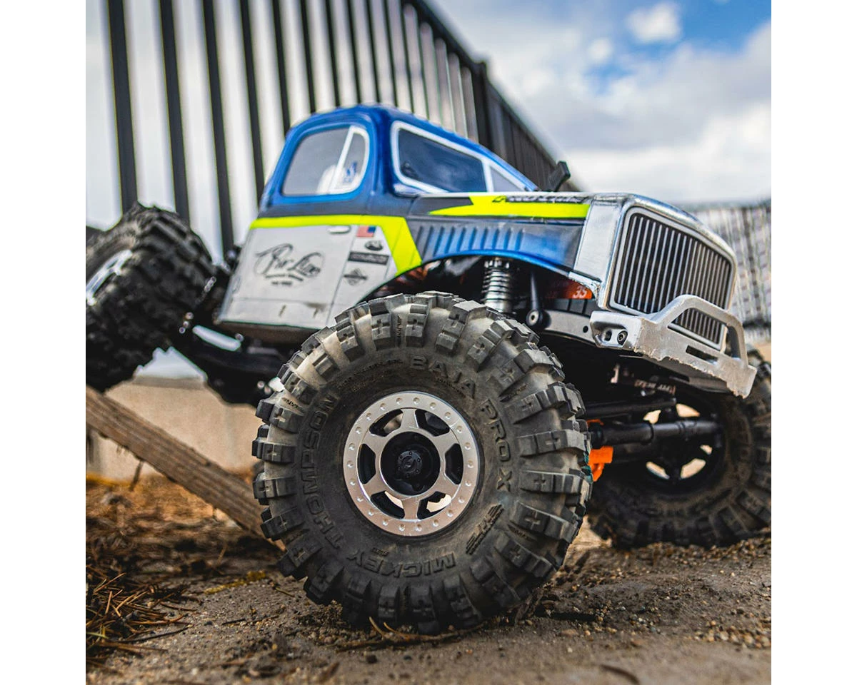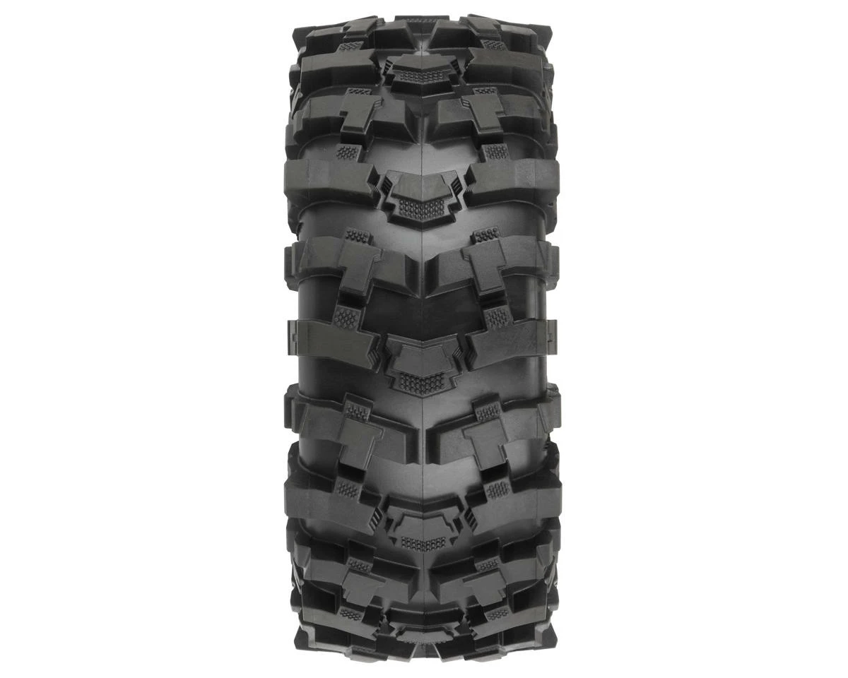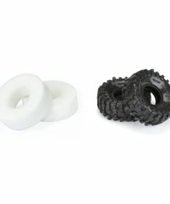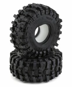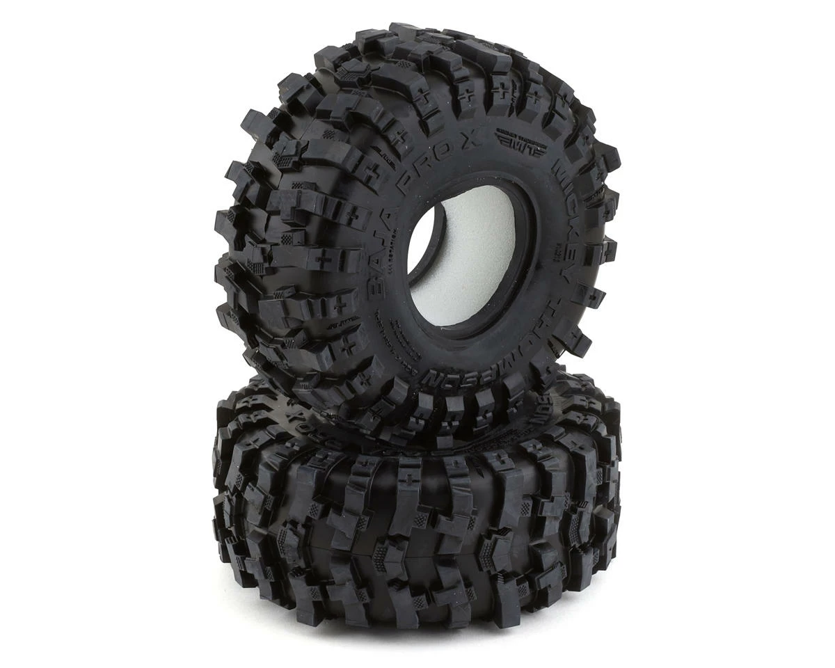 Pro-Line Mickey Thompson Baja Pro X 1.9″ Rock Crawler Tires. These optional tires are scaled-down versions of the full-sized Mickey Thompson Baja Pro X. At a massive 4.85″ tall x 2″ wide, this is one of the largest 1.9″ tires Pro-Line has ever made! Molded in your choice of G8 or Predator compounds, all the details of this gnarly tire are captured in perfect 1/10 scale detail: from the Tread Biter cleats for the added traction to the Mud Scoops for added cleaning power, to the Massive Sidebiters and angled shoulder scallops for ultimate side grip. Symmetric directional tread pattern provides excellent traction and cleaning power as well. Package includes two tires with foam inserts.
