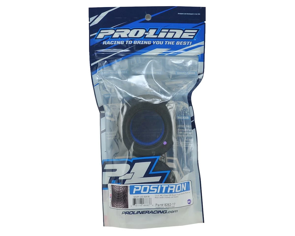 Pro-Line Positron T 2.2″ Truck Tires were designed with a futuristic directional tread to deliver improved grip and corner speed on indoor clay tracks. The tread design pays homage to the Electron and ION tire before it with the 2 center pins boxed in by connected bars for a familiar Pro-Line signature look. From there the connected bars shoot off at angles that have been specifically designed to provide maximum Forward Bite combined with unmatched corner speed all while lasting longer than the competition. The Positron is directional, which adds another tuning option for the racers always looking for that extra edge since it will perform differently depending on which direction it is run.