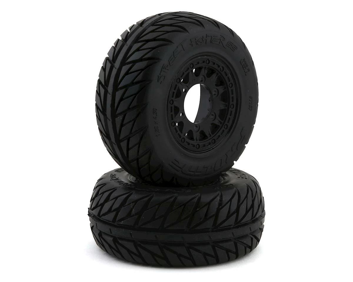 - (2) Street Fighter tires mounted on Raid 2.2″/3.0″ Black 6×30 Removable Hex SC Wheels