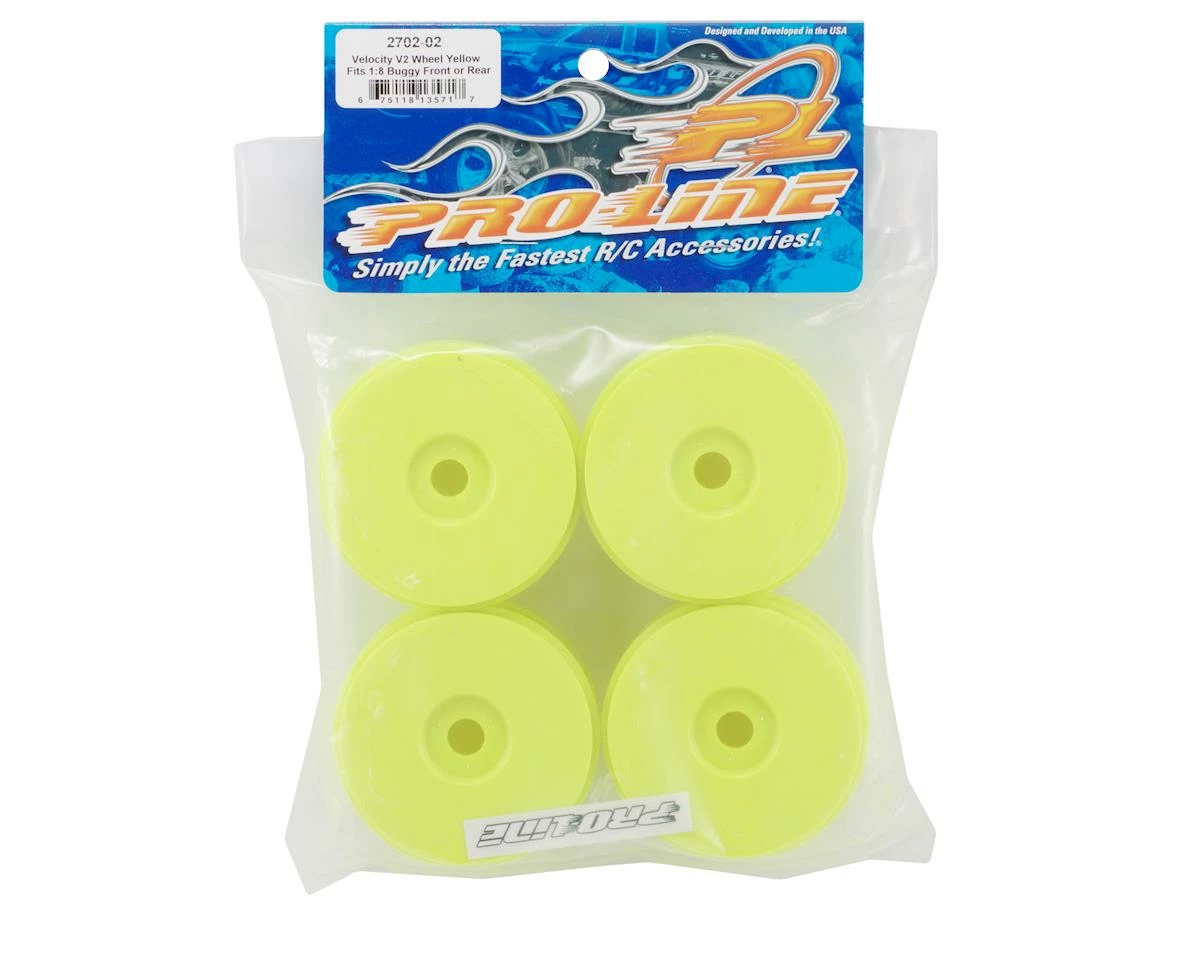 This is a set of four Velocity V2 1/8th scale buggy wheels from Pro-Line. The phrase “bigger is better,” as we have all heard time and time again couldn’t be further from the truth with the new Velocity V2 wheels by Pro-Line. Larger in diameter and width the V2 wheels give your car more traction and stability.