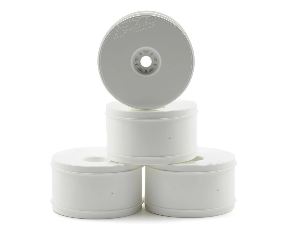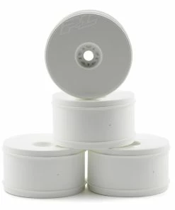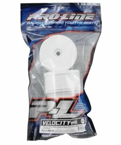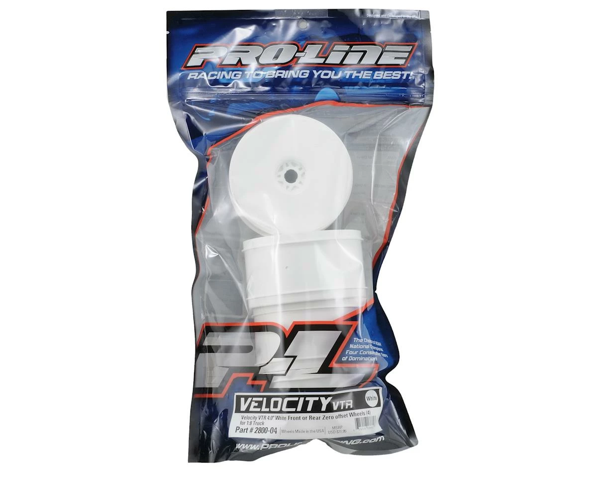 This is a set of four Pro-Line White Velocity VTR 4.0″ Front or Rear Zero offset Wheels. The VTR wheels are a collaborative effort between World Champions Ryan Cavalieri, Billy Easton and Pro-Line’s dedicated in-house engineering team – you’re getting the best of all worlds. Featuring 1:8 buggy style mounting beads for increased bonding strength and easy mounting ability, and the lightest 1:8 Truck wheel, tire, and foam combination available. Textured bonding surfaces with molded in glue channel and a narrow tire profile reduces sidewall flex while increasing agility and responsiveness. Packaged together with resealable bag complete with tire selection chart, tire performance tracking log, and tire identification labels