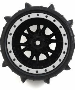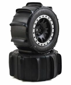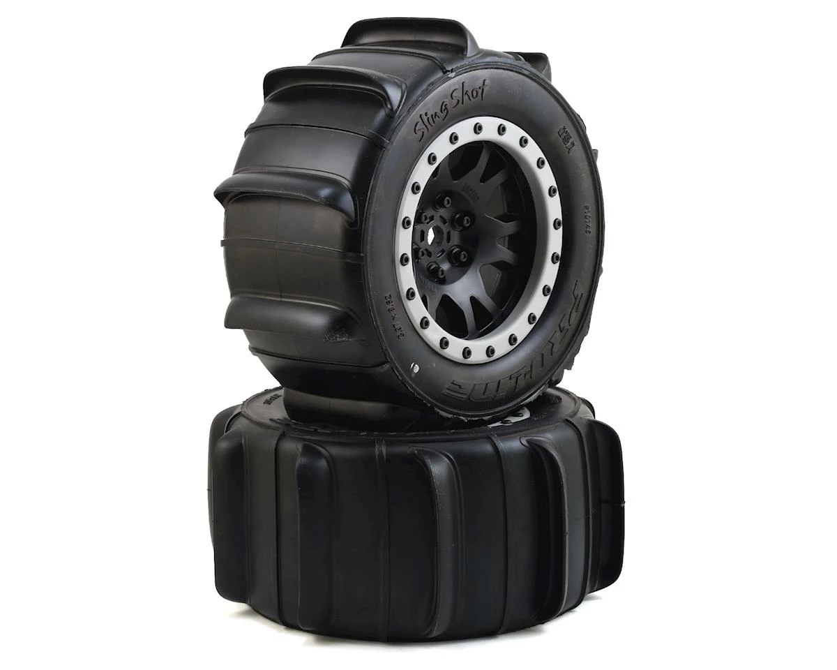 Pro-Line X-Maxx Sling Shot Pre-Mounted Sand Tires have been developed from the ground up for extreme X-MAXX® punishment with a ultra-durable compound that prevents tire ballooning even at high speeds. The Sling Shot 4.3” tire features Pro-Line’s ground breaking proprietary Pro-Loc Technology that creates an ultra-secure bond to Pro-Line’s Impulse Pro-Loc X-MAXX® wheels while still being removable when required. The reinforced Tire bead fits into a uniquely shaped channel on the wheel and the bead-loc screws actually pass through the tire rubber before being pinched by the outer bead-loc ring to create the maximum possible mounting security. This technology debuted on the Badlands MX43 Pro-Loc Tires and has proven to be extremely popular for the X-MAXX® fans.
