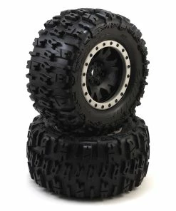 These tires are pre-mounted on the Impulse Pro-Loc Wheels! The Impulse features a proven ground-breaking Bead-Loc design that allows users to change tires or foams when necessary without worrying about the tires coming out of the bead. Pro-Line’s proprietary Pro-Loc Technology brings this feature to life and creates an ultra-secure bond between Pro-Line’s Pro-Loc Tires and Pro-Line’s Impulse Pro-Loc Wheels. The reinforced Tire bead of Pro-Line’s Pro-Loc Tires fit into a uniquely shaped channel on the wheel and the bead-loc screws actually pass through the tire rubber before being pinched by the outer bead-loc ring to create the maximum possible mounting security. The Impulse design is inspired by full-size off-road wheels with a Tough, Blacked-out look and is manufactured at Pro-Line Headquarters in the USA out of extra thick, extremely durable material designed to take some serious abuse.