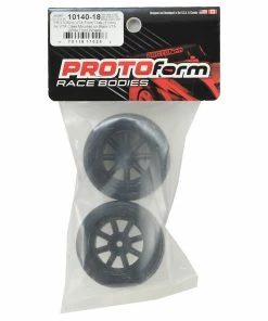 PROTOform’s VTA pre-mounts are sold in pairs and mounted our durable, nylon, 8-spoke wheels. The 26mm fronts are 0 offset, while the 31mm rears measure at +6 offset to fill the rear fenders of your 190mm touring car equipped with a PROTOform VTA body. Choose from white or black options to suit your taste or paint scheme.