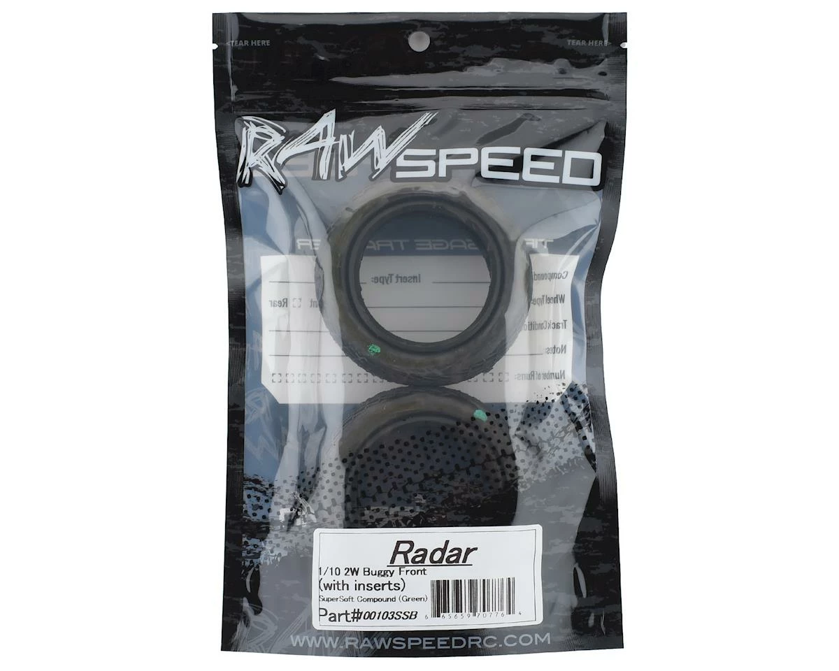 Raw Speed Radar 1/10 Buggy 2wd Front Tires fit industry standard 2.2 inch buggy wheels and include closed cell inserts. Tires are available in soft, soft-long wear, super soft and clay compounds. Package includes two tires with closed cell foams.Â
