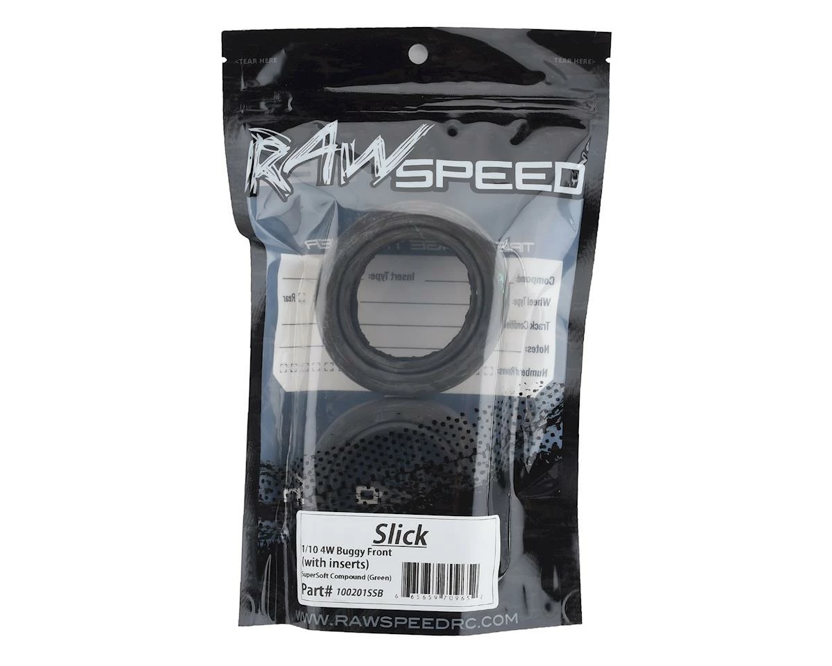 This is a pack of two Raw Speed Slick 2.2″ 1/10 Front 4WD Buggy Tires with included Raw Speed inserts. These front tires are made a little wider to fit standard 4WD front buggy wheels.